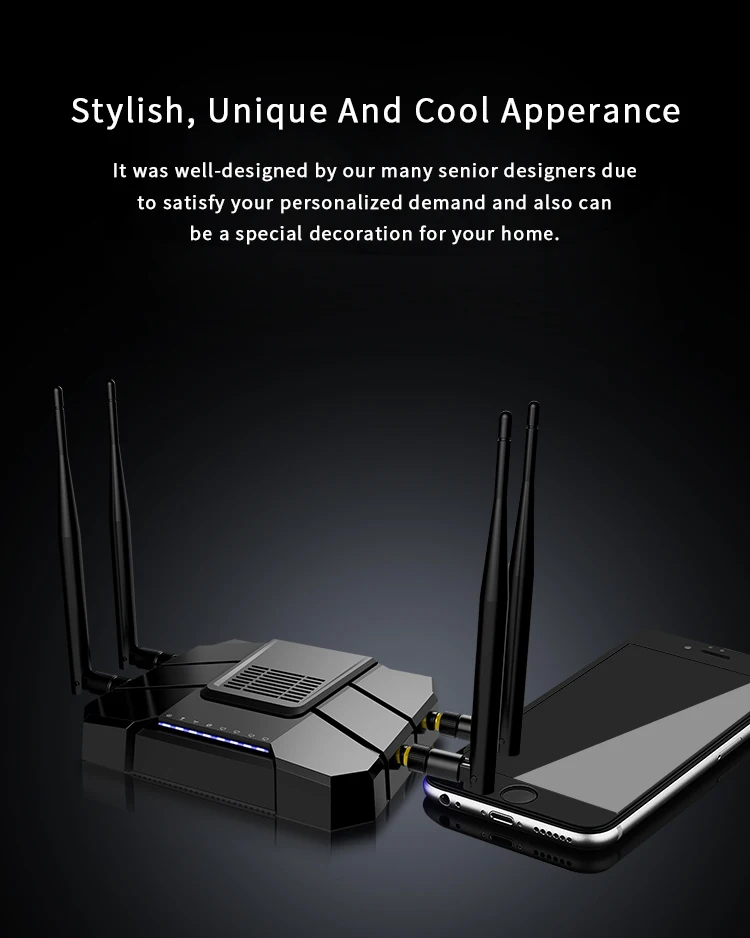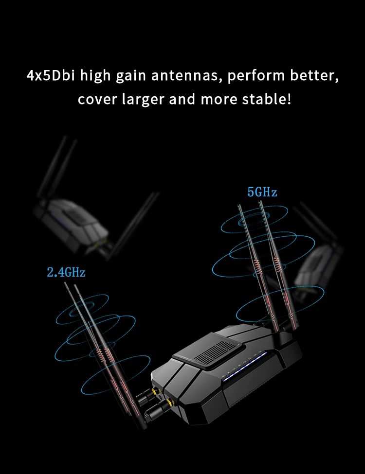 Поддержка беспроводного протокола IEEE802.11ac/n/g/b/a, максимальная скорость беспроводной связи может быть 1200 Мбит/с, 4 × 5Dbi антенны с высоким коэффициентом усиления, лучше выполнять и покрывать больше.