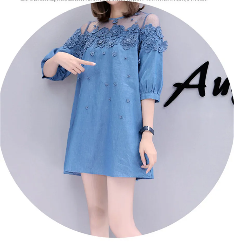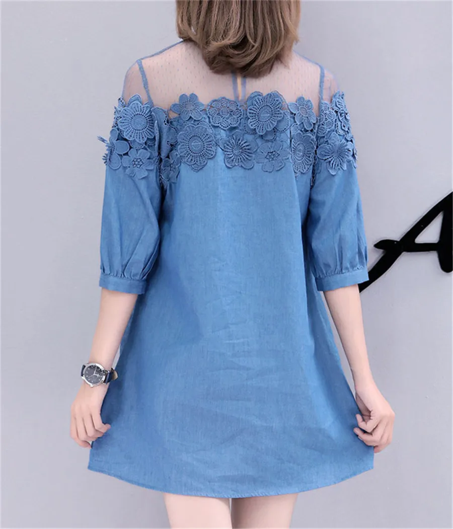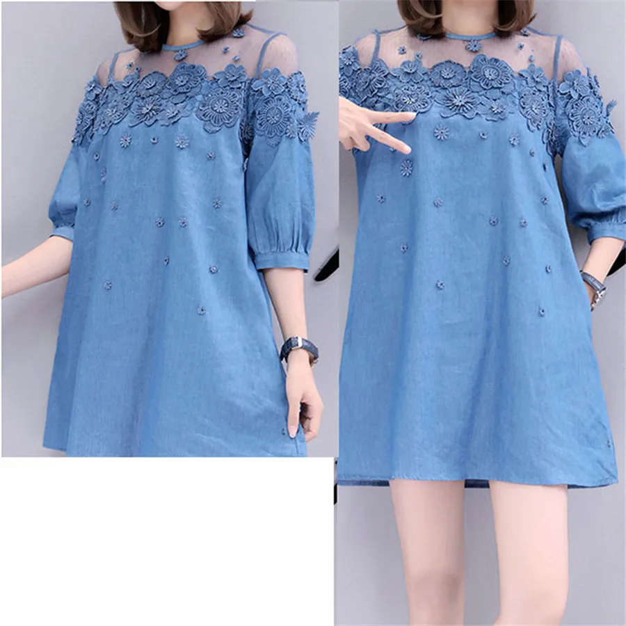 Женское свободное джинсовое платье трапециевидной формы большого размера, новое летнее модное мягкое джинсовое платье из сетчатой ткани с вышитыми цветами