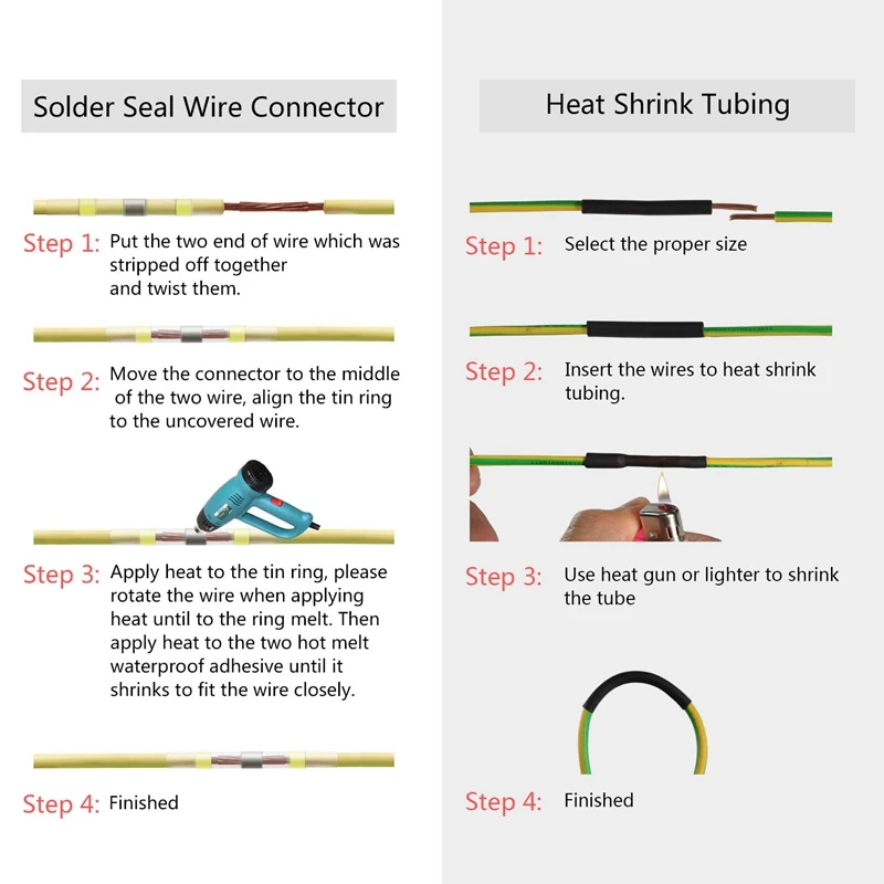 Соединители для уплотнения припоя термоусадочные соответствуют соответствующим стандартам; Коэффициент усадки: 2: 1. Идеально подходит для автомобильных, морских и других наружных применений.
