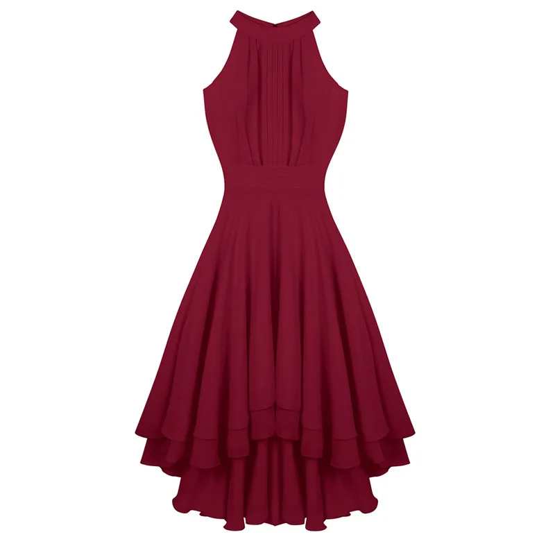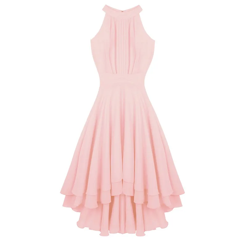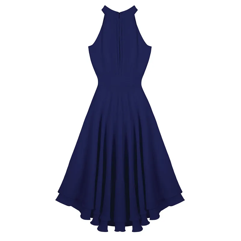 Вырез на шее и без рукавов, дизайн hi-lo, застежка-молния сзади с застежкой, плиссированное украшение на талии.