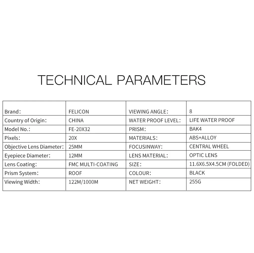 FELICON FE-20X32 Телескоп, Бинокль, 20 раз, 50-1000 метров эффективный, ультра четкое изображение BAK4 призма, система крыши раствор применяется, для высадки или зрения цели, черный