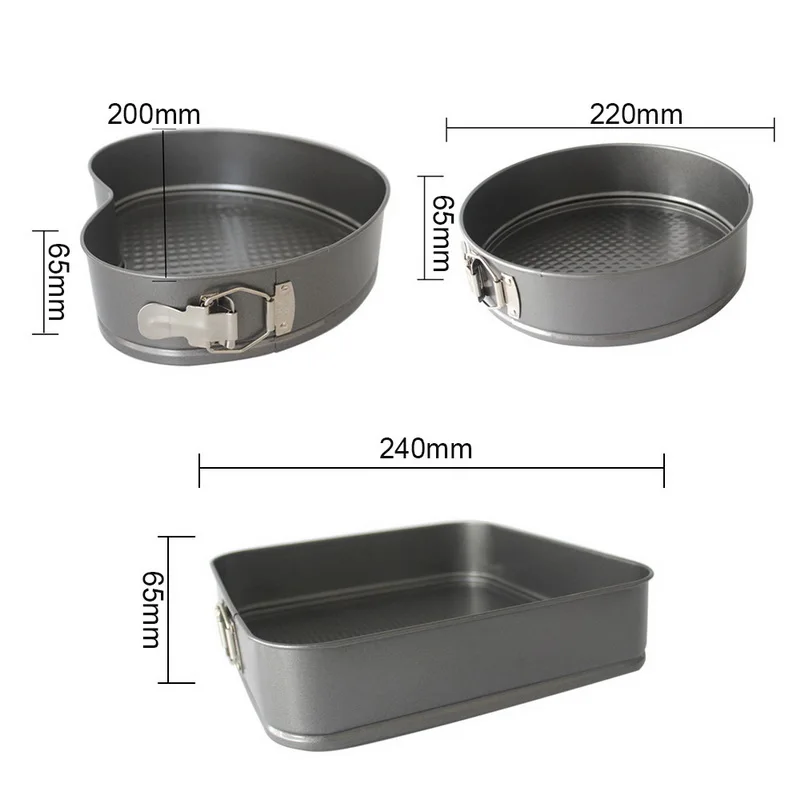 3. Три размера и формы-этот набор состоит из 3 частей антипригарных и герметичных кастрюль, различных размеров и форм, предназначен для изготовления чизкейков и многого другого. Сковородки имеют боковины, которые не имеют основания, выпуская десерты без поломки.
