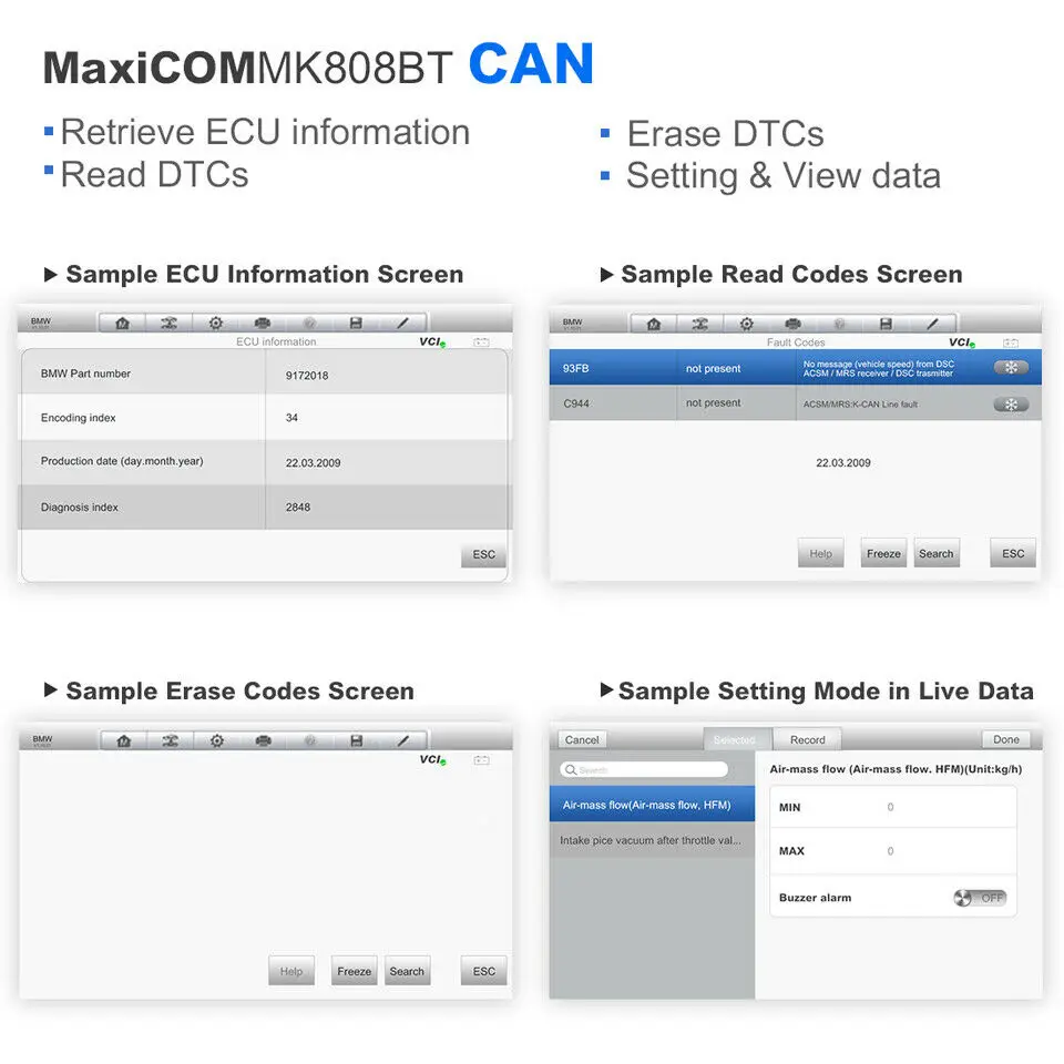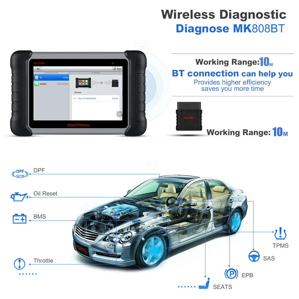 Благодаря мощной Cortex-A9 процессор, а также 7,0 дюймов ЖК-дисплей емкостный сенсорный экран, на базе Android многозадачность операционная система, И в сочетании с возможностью быстрого чтения и очистки DTCs для всех доступных модулей большинства марок и моделей на рынке, MaxiCOM MK808BT-это ваш идеальный инструмент для автоматической диагностики и обслуживания. MK808BT предоставляет вам превосходные специальные функции, включая сброс масла, EPB (электронный стояночный тормоз), SAS (датчик угла поворота руля), BMS (система управления батареей), И DPF (Дизельный сажевый фильтр).