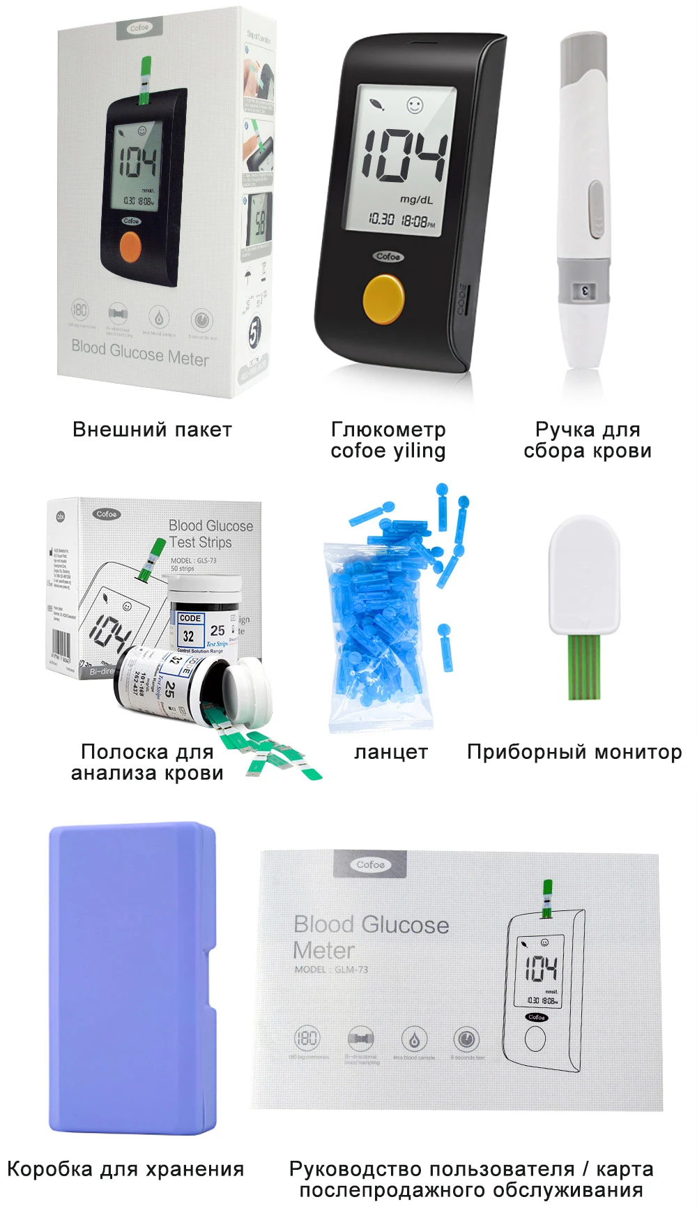 Cofoe Yiling mg / dL Глюкометр Прибор для определения диабета и 50 / 100Pcs тест-полоски и ланцеты Единица