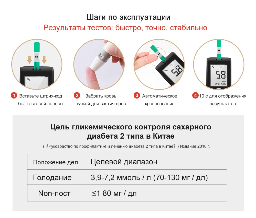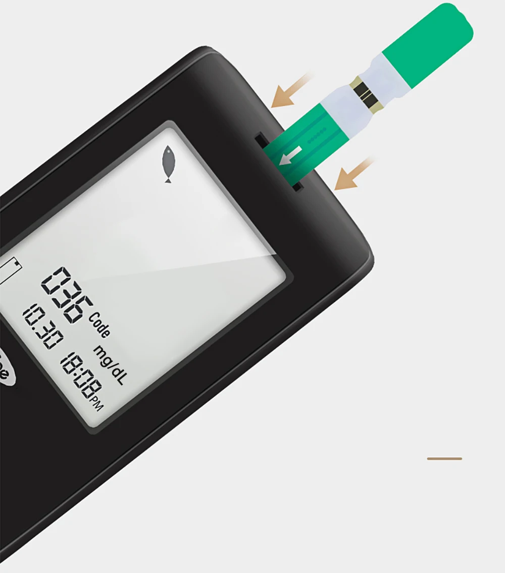 Шаг 1: Глюкометр автоматически включится после установки тест-полоски. Откалибруйте код тест-полоски. Шаг 2: Хорошо установите ручку для сбора крови и отрегулируйте соответствующую передачу для сбора образца крови. Шаг 3: Автоматический сифон 1 мкл крови. Шаг 4: Показать значение глюкозы в крови через 8 секунд.