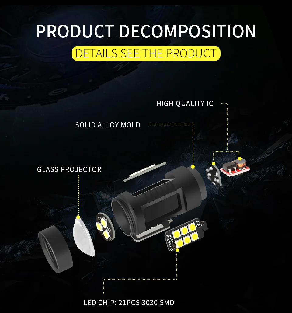 Высокая Выходная Потребляемая мощность при реальной 6 Вт за пару Удивительная высокая светоотдача 1200 лм на лампу Варианты освещения включают 3 очаровательных цвета Простая установка без предупреждения на ПК плате, означает, что предупреждение об ошибке бесплатно или ОК для canbus Без предупреждения на ПК, CAN bus ready Длительный срок службы
