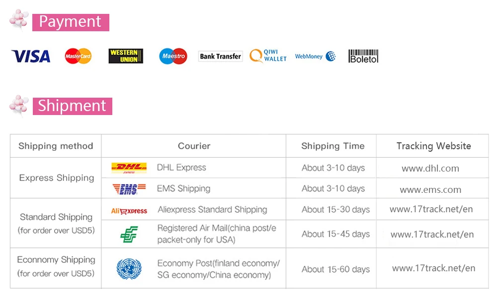 Политика доставки и возврата: 1. Мы обычно осуществляем заказы в течение 24 часов после получения оплаты. 2. China post ordinary small packet plus и China post registered air mail занимает 15-60 дней. 3. Рекомендуемые поставки: Стандартная доставка Aliexpress-более стабильная, безопасная, быстрая. 4. Мы также предлагаем Экспресс-доставку, такую как DHL, UPS, EMS и т. д., пожалуйста, не стесняйтесь связаться с нами, если вы срочно нуждаетесь в нем или количество большое. 5. Мы принимаем возврат и возмещение в течение 15 дней после завершения заказа, пожалуйста, свяжитесь с нами. Прямая поставка и оптовая продажа: 1. Мы осуществляем доставку по всему миру, пожалуйста, свяжитесь с нами, если у вас есть какие-либо вопросы или проблемы 2. Мы предложим лучшую цену для оптовой продажи и порекомендуем лучшую доставку. Обратная связь: 1. Пожалуйста, оставьте 5 звезд обратной связи, если вы удовлетворены нашей продукцией и обслуживанием, Мы будем признательны (товар, как описано 5 звезд, связь 5 звезд, время доставки 5 звезд). 2. если продукты, которые вы получили, были повреждены или неправильные стили, пожалуйста, не оставляйте отрицательный отзыв, пожалуйста, свяжитесь с нами, мы разберемся с этим и разработаем лучшие решения, ваше удовлетворение-это наша мотивация к лучшему.