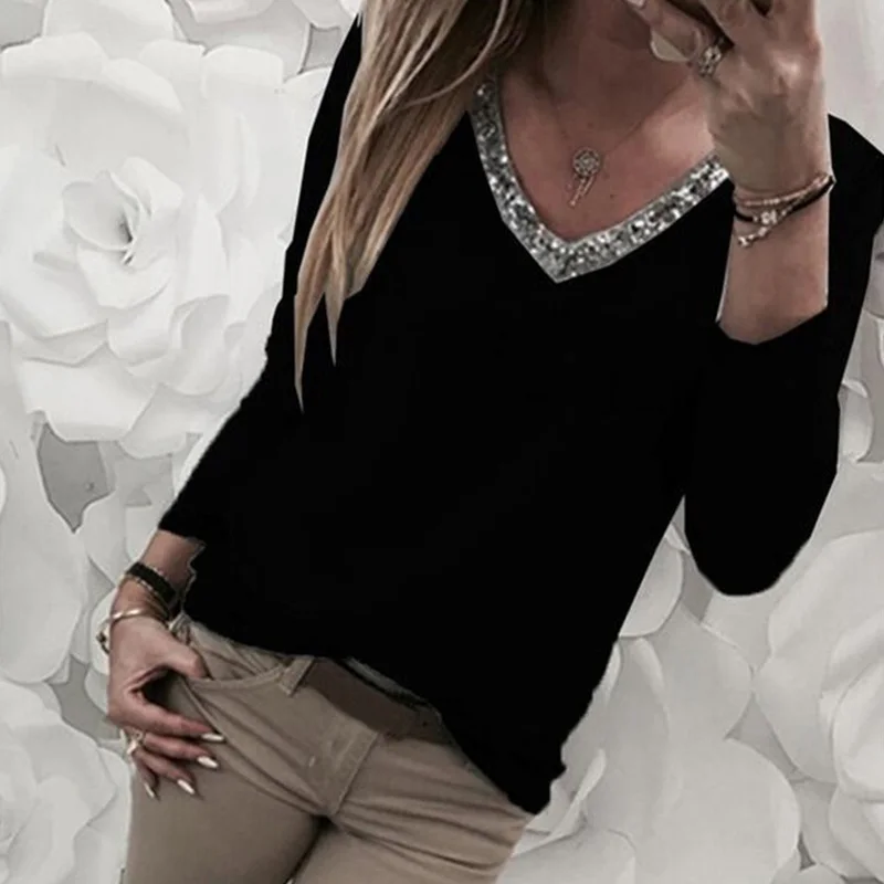 Эта блузка-это то, что мы представляем, как идеально смотрятся вечерние наряды. Изготовлено из мягкой ткани и украшено блестящими блестками; Светильник украшен v-образным вырезом и длинными рукавами. Сочетайте его с однотонными джинсами.