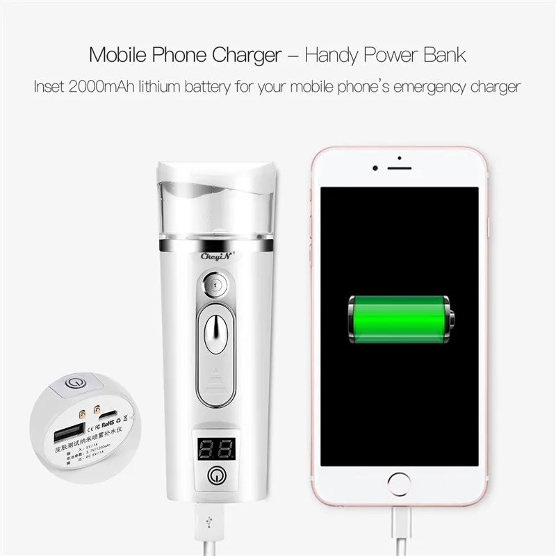 Удобен в переноске, замечательный компаньон для путешествий, это нано-распылитель также может использоваться в качестве power bank, emergently зарядки вашего мобильного телефона.