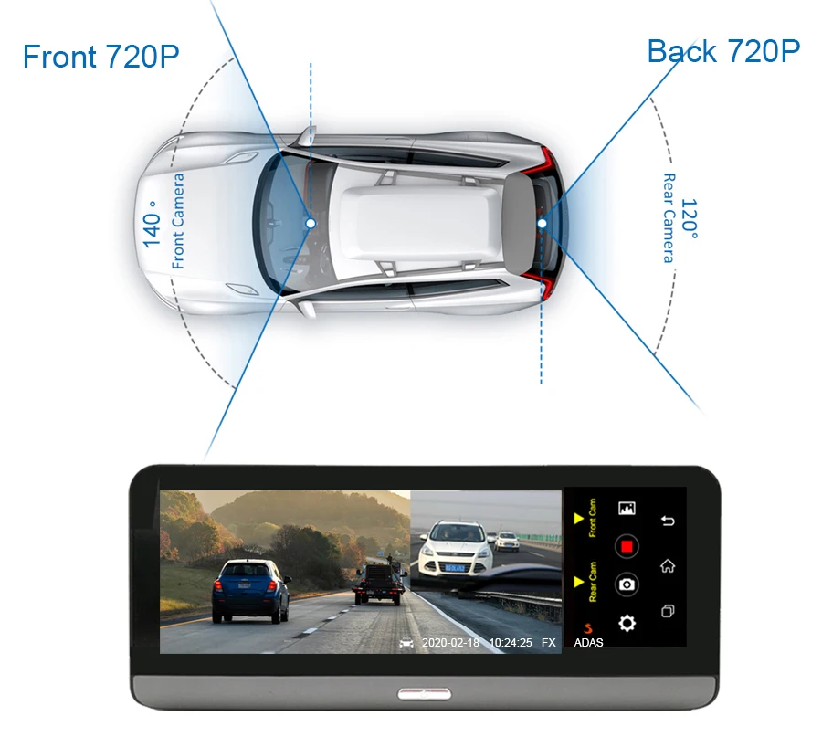 Это устройство поставляется с двумя широкоугольными камерами и может для передней и задней части вашего vehide.Фронтальная 1208*720P, задняя 1920*1080P; Две HD камеры могут записывать одновременно автоматически захватывая каждый мимолетный момент.Авто обратный вид парковки