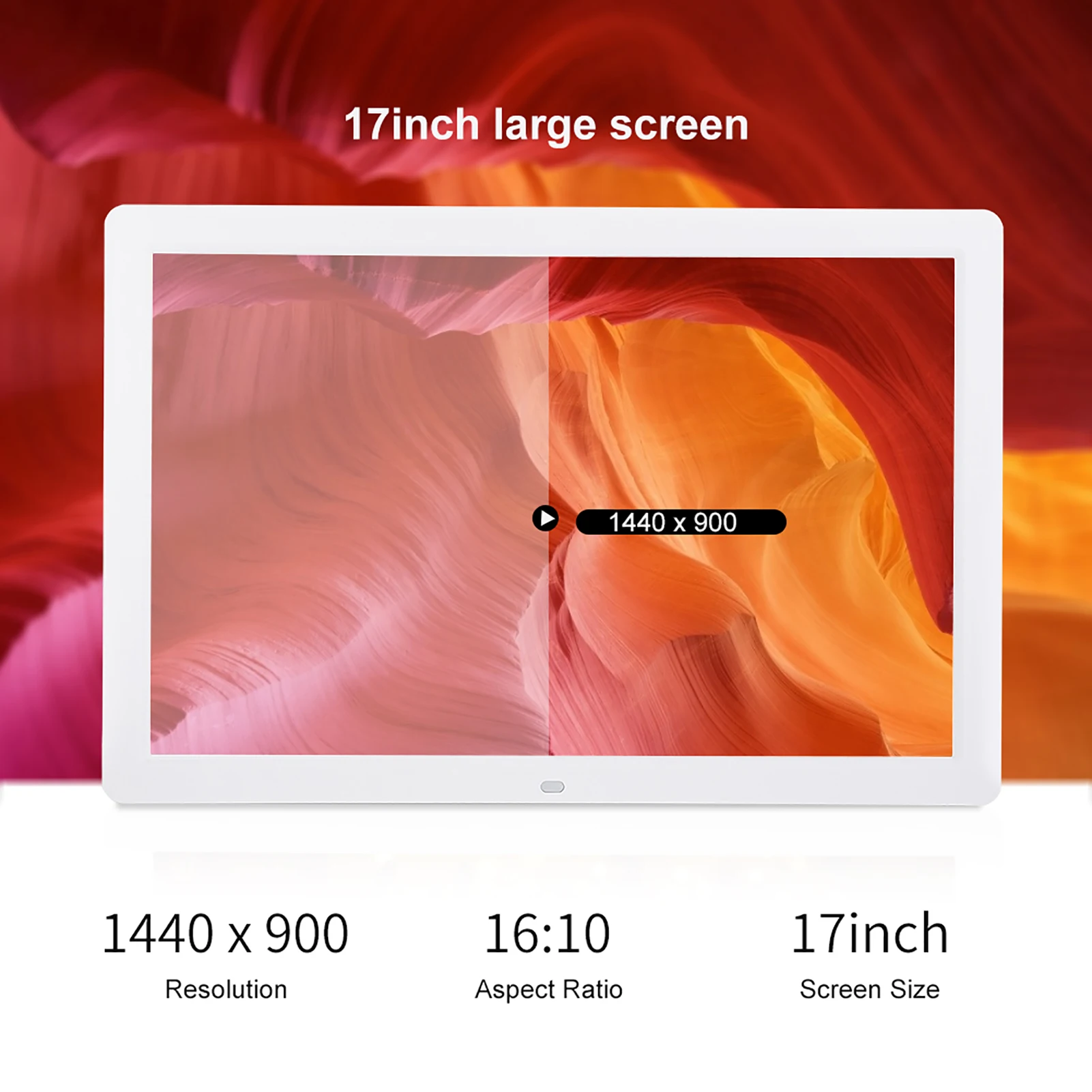 17 дюймов большой экран, 1440*900 разрешение HD, обеспечивает высокое разрешение изображения и видео, передает подлинные цвета на фотографиях показаны разные варианты с меньшим количеством потребеление энергии.