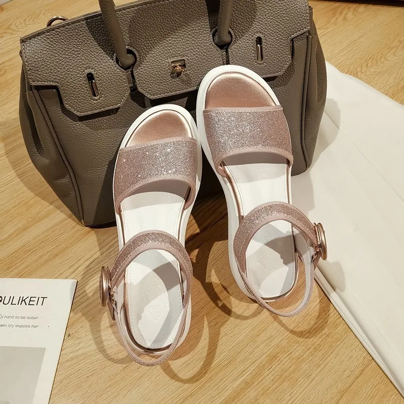 Сандалии на плоской платформе; женские блестящие Летние босоножки; Новинка 2019 года; Модные женские повседневные сандалии с ремешком на щиколотке; женская обувь с пряжкой; цвет розовый, серебристый; D064