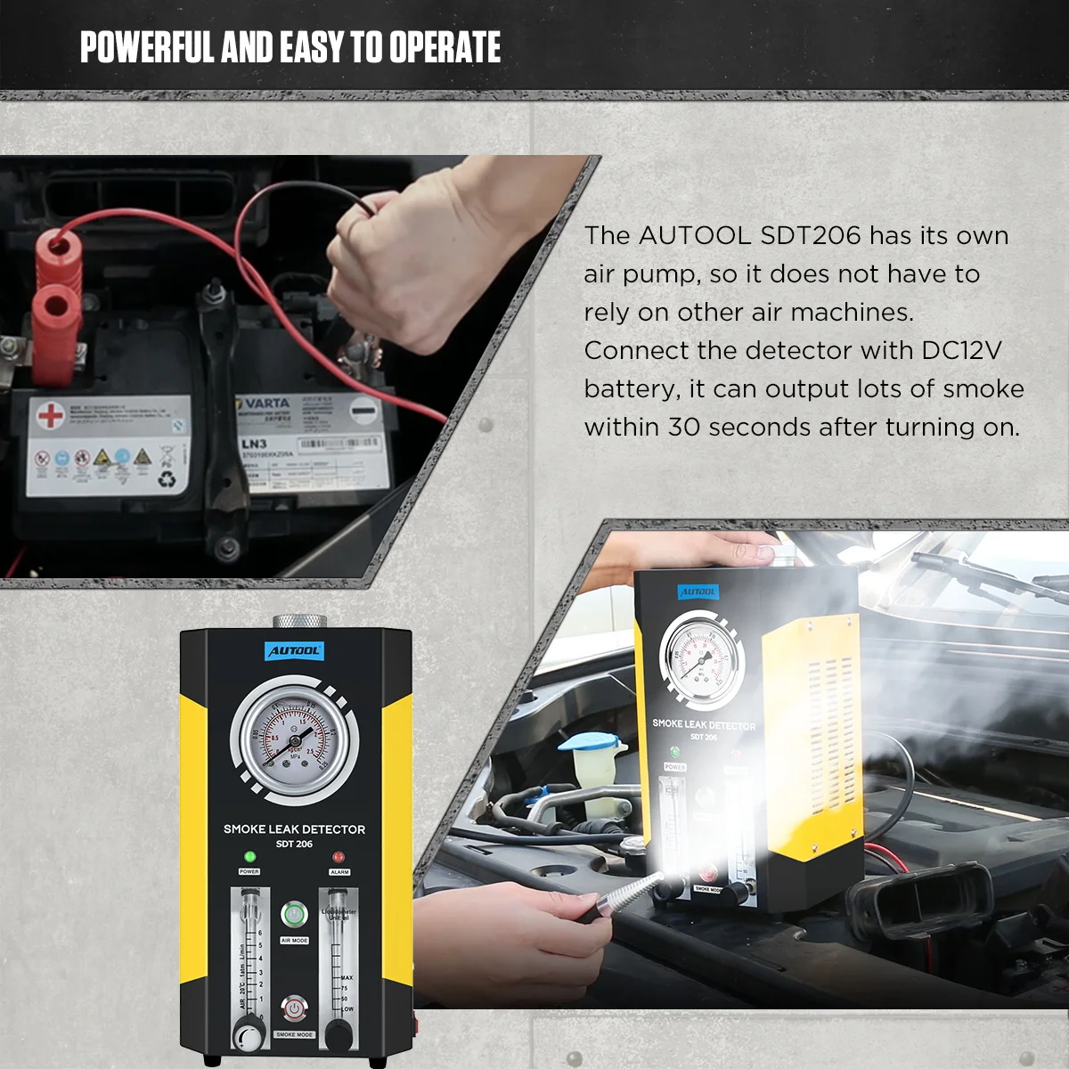 2. Мощный и простой в эксплуатации:AUTOOL SDT 206 имеет свой собственный воздушный насос, не полагаясь на другие машины и манометр с точными весами. Просто подключите детектор к аккумулятору DC12V, он может выводить плотный дым в течение 30 с после включения.