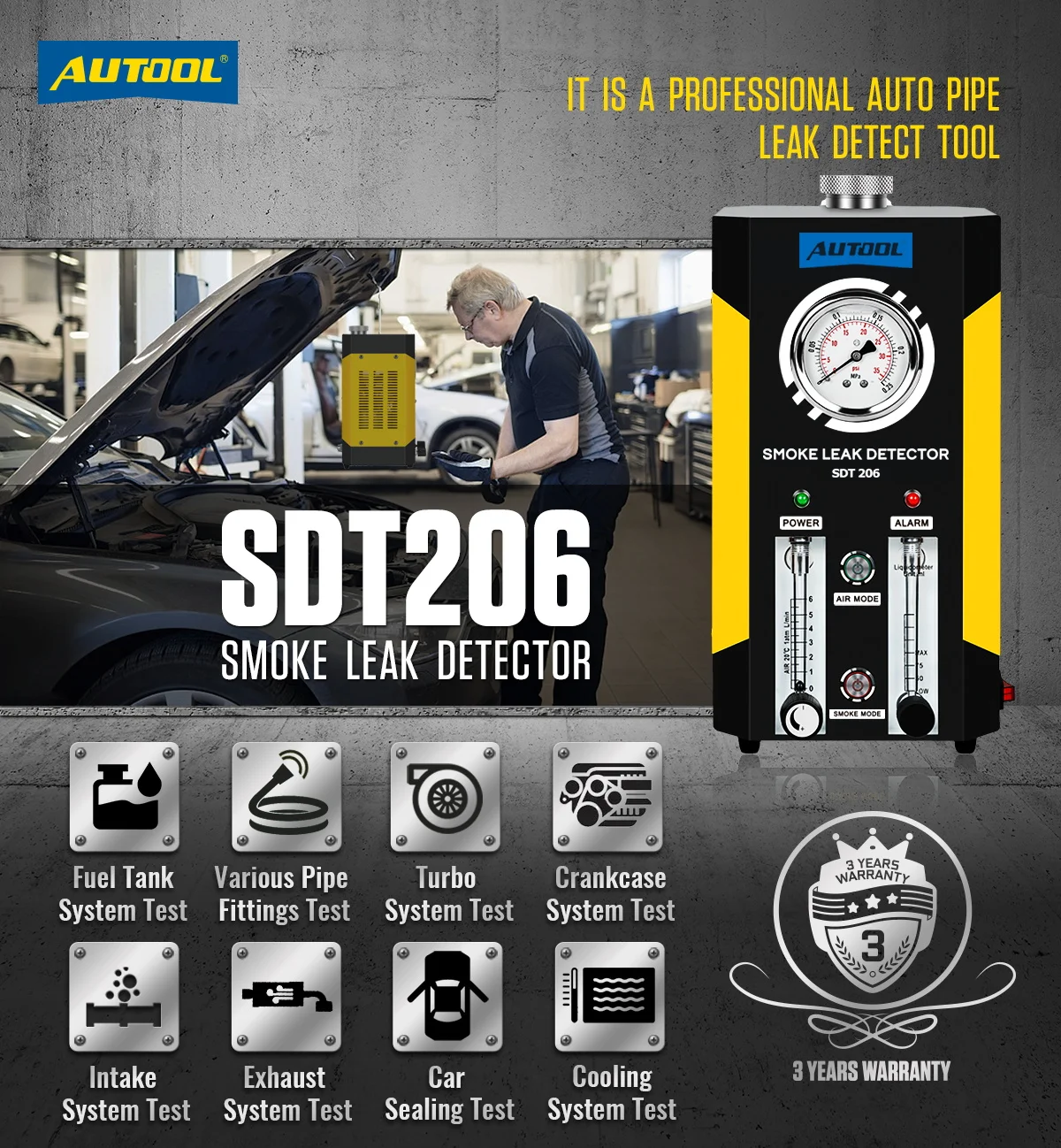 AUTOOL Модернизированный SDT 206 детектор утечки дыма для автомобиля-это профессиональный инструмент для обнаружения утечки автомобильных труб. Это поможет нам быстро и точно установить на Трубопроводные системы утечки автомобилей мотоциклов, таких как