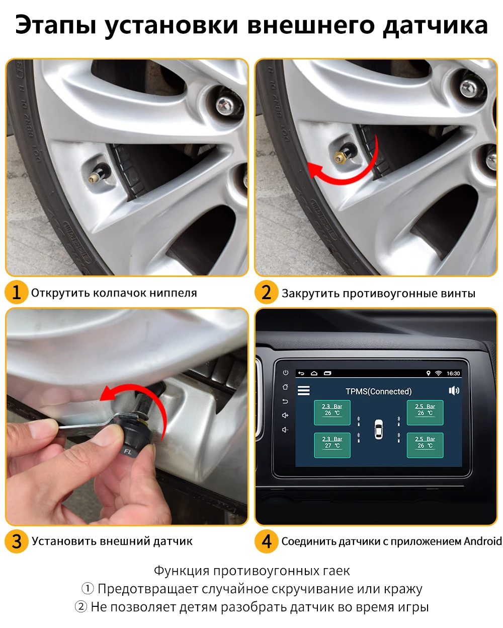 - Поддержка запасного колеса (MU9F-5 / MU7J-5 модели) - Поддержка смены летних/зимних колес с помощью двух наборов сенсоров - Широкий диапазон настройки контроля давления (от 0 до 8 бар) TPMS для DVD / Навигации автомобиля на Android - Приемник TPMS может быть подключен к машинному DVD на базе Android через USB порт - Значения давления и температуры в шинах выводятся на экран DVD автомобиля на базе Android - Звуковое оповещение через динамики автомобиля и экранное оповещение при возникновении неисправности - Предотвращает разрыв шины, продлевает срок службы шин и экономит топливо Отличная функция обнаружения движения (только MU9F) - Датчик включается автоматически, как только колесо начинает вращаться - Быстрое обновление значений давления и температуры в шинах в приложении Android TPMS App - Автоматически перестает работать после парковки для экономии энергии Защита для безопасного вождения ① Оповещение о высоком давлении ② Оповещение о низком давлении ③ Оповещение об утечке воздуха ④ Оповещение о высокой температуре ⑤ Оповещение о низком заряде батареи ⑥ Оповещение об отключении датчиков Высокая точность и высокое качество (только MU9F) - NXP (Freescale) TPMS чипсет – FXTH 87E ① Проверенная на практике архитектура двухосного акселерометра ② Ось XZ позволяет обнаружить движение ③ Таймер пробуждения с низким энергопотреблением, автономный счетчик и периодический сброс приводятся в действие LFO Смена положения шины без ограничений - Особенно когда вы меняете запасное колесо (поддержка MU9F-5 / MUJ-5) - Легко взаимодействие с нашим приложением TPMS App Поддержка языков - Английский, русский, испанский, немецкий, итальянский, португальский, японский, вьетнамский, упрощенный/традиционный китайский
