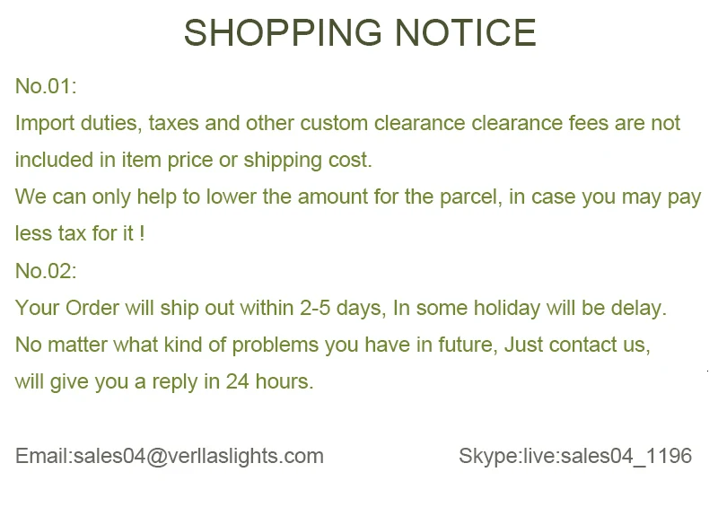 1. Импортные пошлины, налоги и другие таможенные сборы не включены в цену товара или стоимость доставки. Это ответственность покупателя. Пожалуйста, проверьте в вашем таможенном офисе, чтобы определить, какие дополнительные расходы будут до вашей покупки. Мы можем декларировать более низкую стоимость, чтобы помочь вам избежать некоторых налогов по вашему запросу.
