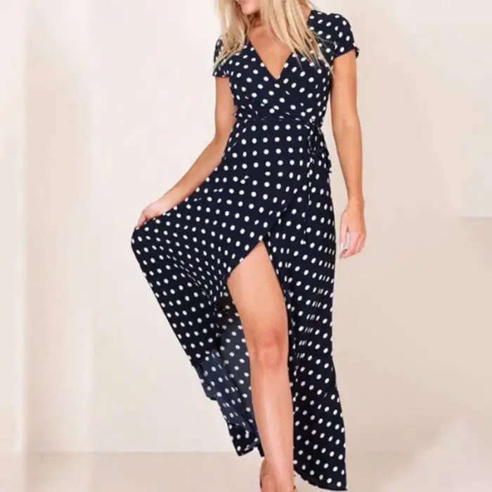 Женское длинное платье макси в горошек с v-образным вырезом и коротким рукавом для летней вечеринки IK88