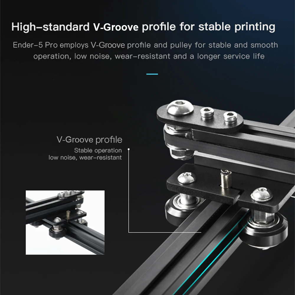 Высокий стандарт V шкив профиля, работает стабильно и плавно, низкий уровень шума и хорошая износостойкость. Высокоточный MK-10 экструдер, значительно снижает риск засорения и неровной экструзии.