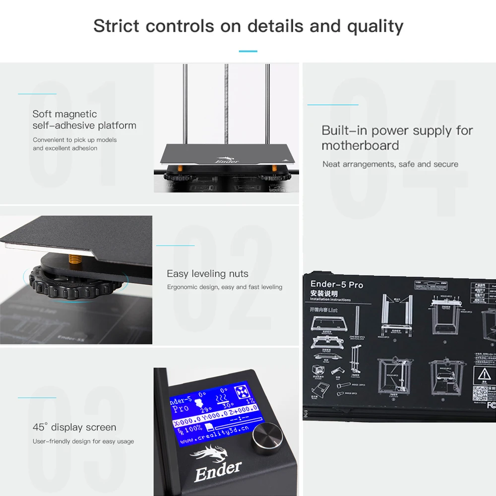 Импортированная синяя PTFE трубка; Металлический экструдирующий блок, стабильная подача и износостойкость; Экран дисплея 45 °, удобный дизайн для легкого использования; двойная система управления по оси Y с синхронной работой и стабильным выходом, чтобы избежать вибраций, вызванных длительной печатью.