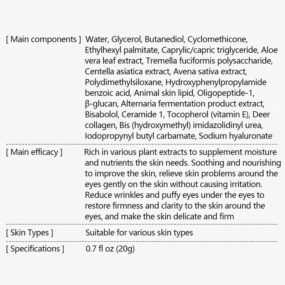 2. Восстанавливает усталость глаз-питается множеством питательных веществ к нижней части кожи, глубоко увлажняет кожу вокруг глаз, снимает усталость глаз, сокращает отечность, удаляет темный круг.