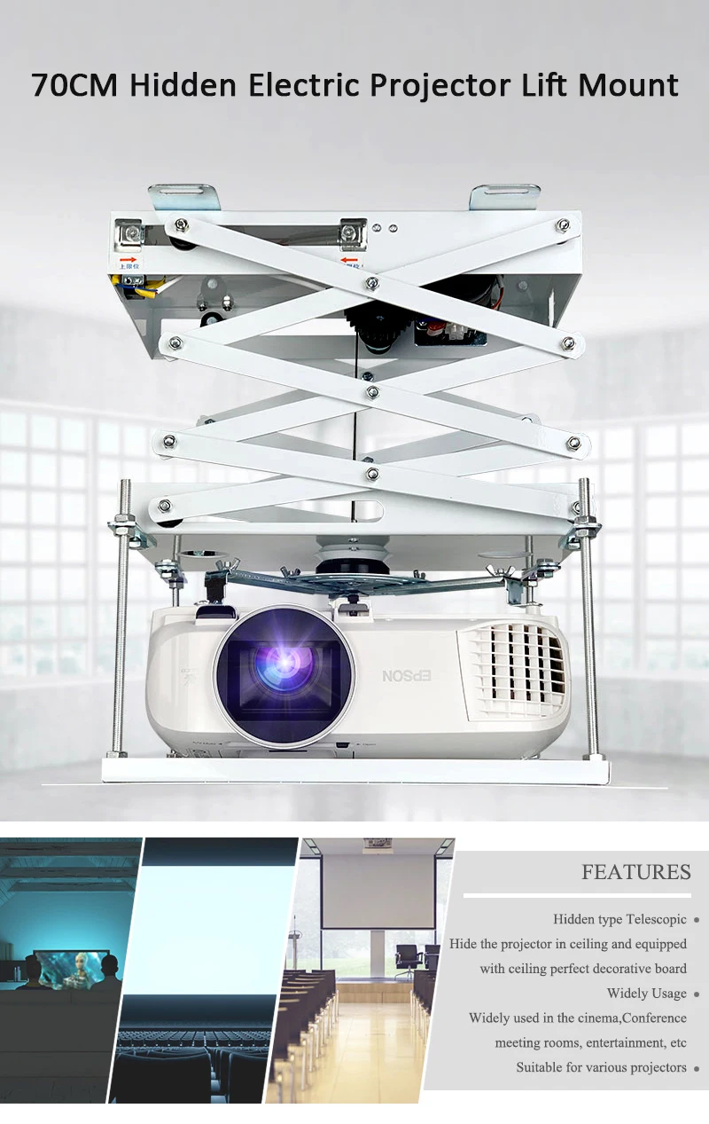 【Мощный машинный двигатель 】максимальная нагрузка до 10 кг с 48 см * 48 см стандартной базовой платой. Используйте стандартную опорную панель, размер вашего проектора должен быть меньше 42*42 см. (Если ваш проектор больше, пожалуйста, свяжитесь с нами для настройки базовой платы.) Перед заказом, вы можете сообщить нам ширину и длину вашего проектора, чтобы мы могли помочь вам определить, выдает ли наш Монтажный кронштейн для вашего проектора. 【 Телескопический проектор скрытого типа 】оснащен потолочной идеальной декоративной доской, эта машина может скрывать проектор в потолке, достигая идеального скрытого эффекта и обеспечивая гибкое использование на основе фактического состояния. Он также имеет характеристики элегантного дизайна внешнего вида, безопасность и надежность, точное позиционирование, низкий уровень шума и удобная установка. 【Широкое применение 】подходит для различных проекторов; В основном используется в областях многофункциональных конференц-залов, многофункциональных залов, Международного конференц-центра, учебного центра, академического зала, аудиовизуального зала, отели, дома, сцены, классы, учебные центры и другие места. 【Установочный номер 】 1. Сложенная высота составляет около 14 см (не включает высоту проектора и опорной плиты), а расстояние между потолком и плинтусом должно быть не менее 30 см; 2. Чтобы закрыть отверстие, отверстие для потолка должно быть больше 42*42 см, меньше 48 см * 48 см; 3. Чтобы сохранить достаточную способность подшипника, взрывные болты должны быть установлены глубоко в бетон или кладку или более сильный потолок.