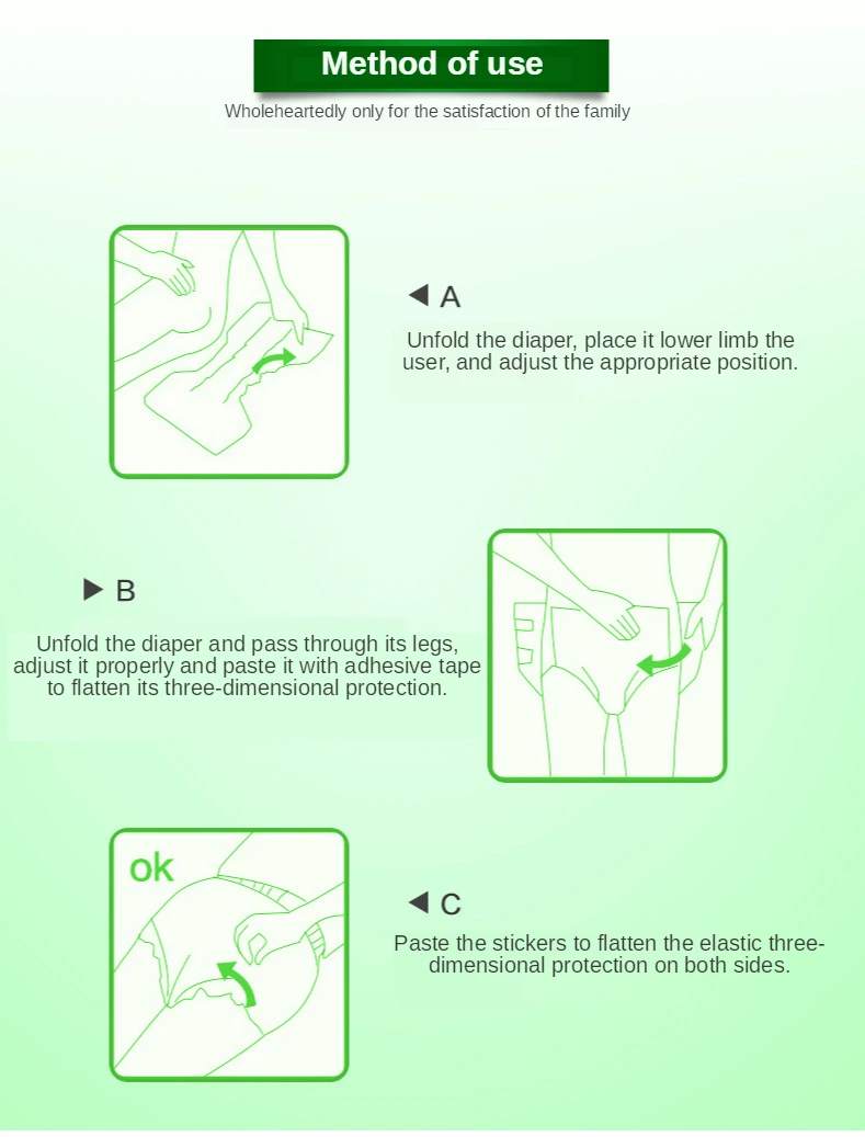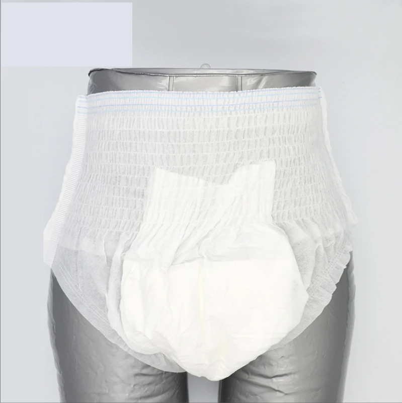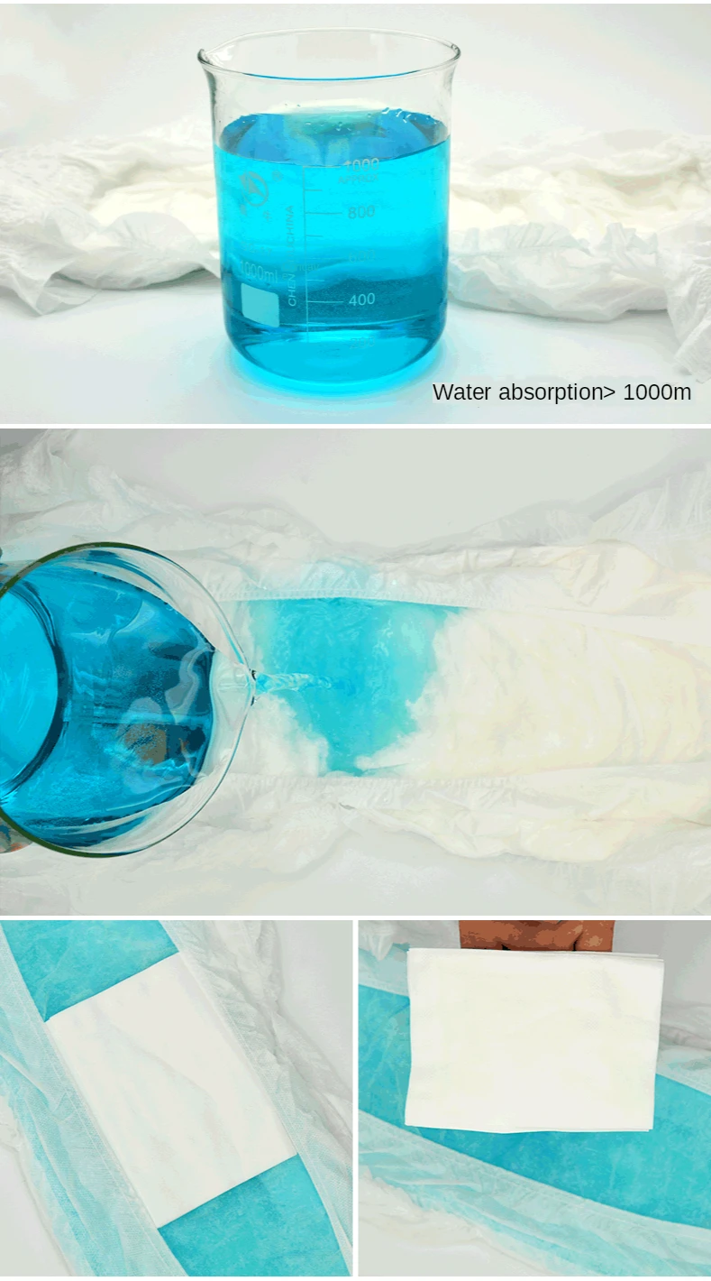 Основные характеристики: 1. Белая PE пластиковая Водонепроницаемая подкладка 2. Мягкий поверхностный слой, тканевая задняя панель, комфортные ощущения от руки 3. Супер Поглощение, Блокировка воды, сохраняет кожу сухой 4. Тип брюк, легко надевать и снимать 5. Принимает полимерные абсорбирующие и пушистые целлюлозы; Водопоглощающая структура, с сильной поглощающей способностью! 6. Он может много раз поглощать мочу и другие жидкости для тела, чтобы сохранить поверхность меняющейся подкладки сухой. 7. Быстро впитывает фекалии и удаляет неприятные запахи для обеспечения свежего воздуха в помещении. 8. Простота в использовании, охрана окружающей среды и санитария.