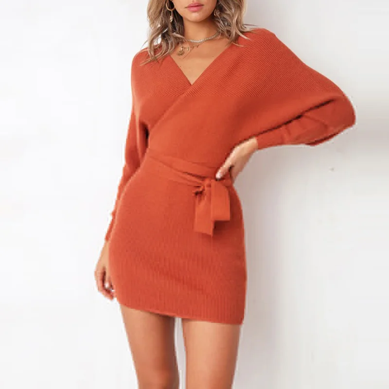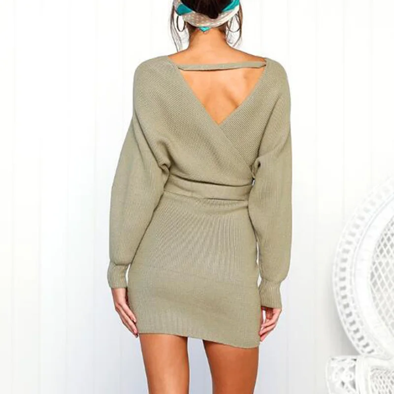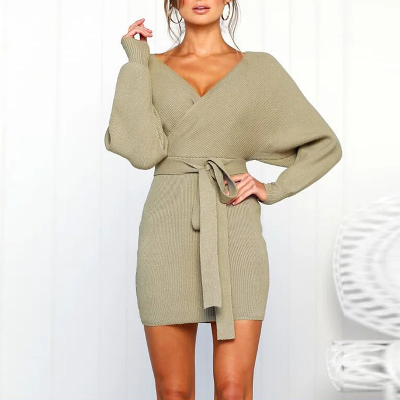 * Описание товара: женское облегающее трикотажное платье с v-образным вырезом и длинным рукавом, теплое зимнее платье