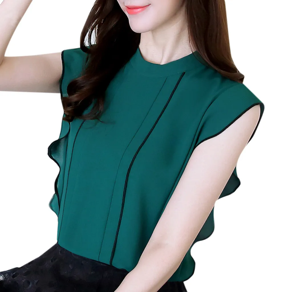 Женская короткая шифоновая Повседневная футболка без рукавов с рюшами и круглым вырезом