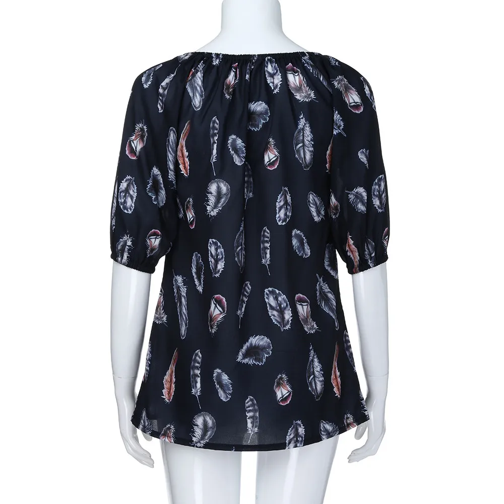 Женская блузка с v-образным вырезом CHAMSGEND, летняя блузка свободного кроя с принтом перьев и коротким рукавом, большие размеры