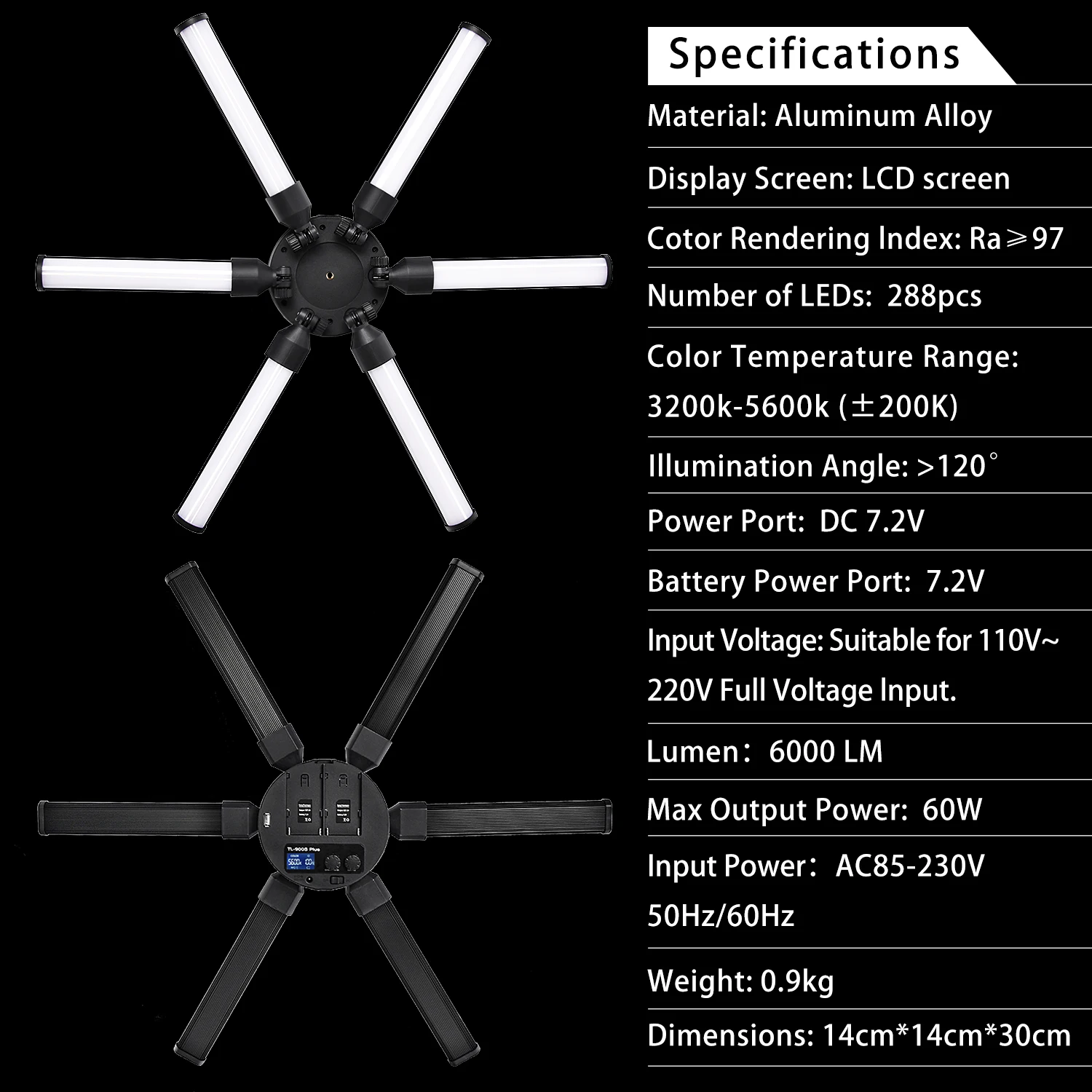 Продажа от бренда fosoto Инструкция по использованию TL-900S большие глаза цифровая фотография светильник взять круг в качестве центра наружного излучения конструкция состоит из 6 светодиодный трубки, цветовая температура от 3200K до 5600K, Плавная затемнения яркость. Высокий CRI с стабильной цветовой температурой. Две батареи могут быть установлены для удовлетворения различных потребностей, и батареи могут быть заряжены адаптером питания без использования дополнительного зарядного устройства (не включая). Можно использовать usb-разъем для зарядки ваш мобильный телефон и другие устройства, чтобы обеспечить непрерывный источник питания. Оснащен беспроводным Bluetooth пультом дистанционного управления для дистанционного управления. Можно использовать мини-зеркало (не входит в комплект) в центре, более удобное для жизни и макияжа. Используется для видео в реальном времени, макияжа красоты, студийной фотографии, обучения фотографии и других областях. Светильник источник: 2835 светодиодный SMD Количество светодиодов: 288 шт. Входная мощность: 100-230 В 50 Гц/60 Гц Выходная мощность: 6*10 Вт 60 Вт Ультратонкое естественное освещение CRI:97 Размер: 140*140*310 мм Полностью разложенный Размер: 640*640*28 мм Цветовая температура: 3200-5600k Регулировка яркости: Да Диапазон затемнения: 10%-100% Переходник: Универсальный Совместимые батареи: Серия Sony NP-F: NP-F750; NP-F550; NP-F950/B Лампу можно использовать для батарей, так что вы можете использовать лампу на открытом воздухе (Примечание: аккумулятор в комплект не входит, вы можете купить его в своей стране) Отличительный звездный свет, который делает ваши глаза сияющими, как звездный свет