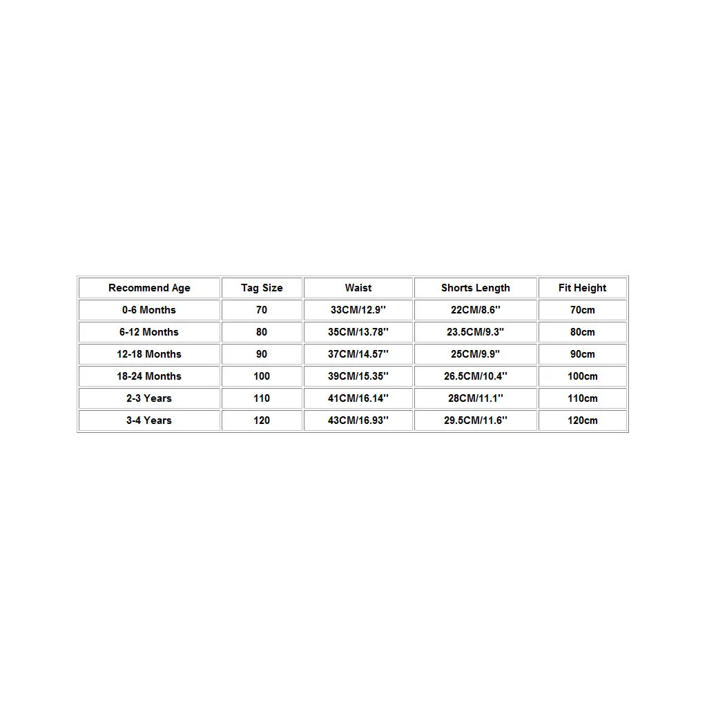 Рекомендуемый возраст Размер бирки Талия Длина шорт Подходящая высота 0-6 месяцев 70 33 см/12,9 дюйма 22 см/8,6'' 70 см 6-12 месяцев 80 35 см/13,78'' 23,5 см/9,3 дюйма 80 см 12-18 месяцев 90 37 см/14,57'' 25 см/9,9 дюйма 90 см 18-24 месяцев 100 39 см/15,35'' 26,5 см/10,4 дюйма 100 см От 2 до 3 лет 110 41 см/16,14'' 28 см/11,1'' 110 см От 3 до 4 лет 120 43 см/16,93'' 29,5 см/11,6'' 120 см