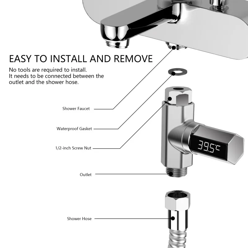 Спецификация-Материал: ABS, PC. Размер: Подключите к стандартному 1/2 дюймовому шлангу или насадке для душа. Диапазон температур: 5 ~ 85u2103 (41 ~ 185u2109). Батареи не требуются-устройство собирает свою энергию из потока воды. Быстрая и простая установка без каких-либо инструментов. Не используйте такие инструменты, как ключи, чтобы избежать повреждения термометра. Автономный термометр без батареи для контроля температуры душа. Новейшие инновационные технологии для обновления и модернизации вашей ванной комнаты. Особенно для семьи с малышами или детьми. Высокоточный датчик температуры вращающийся на 360 ° Водонепроницаемый светодиодный экран для лучшего просмотра.
