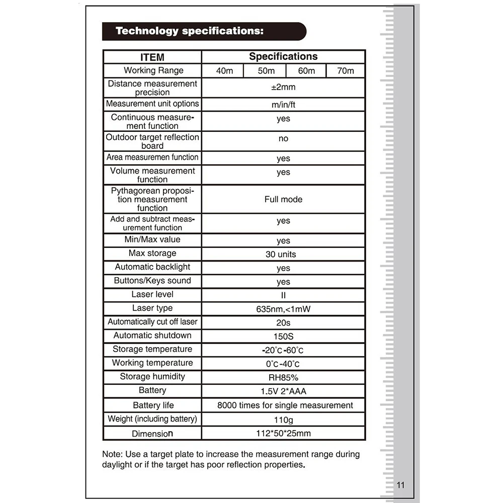 Диапазон измерения: 40 м, 60 м, 80 м, 100 м (опционально)