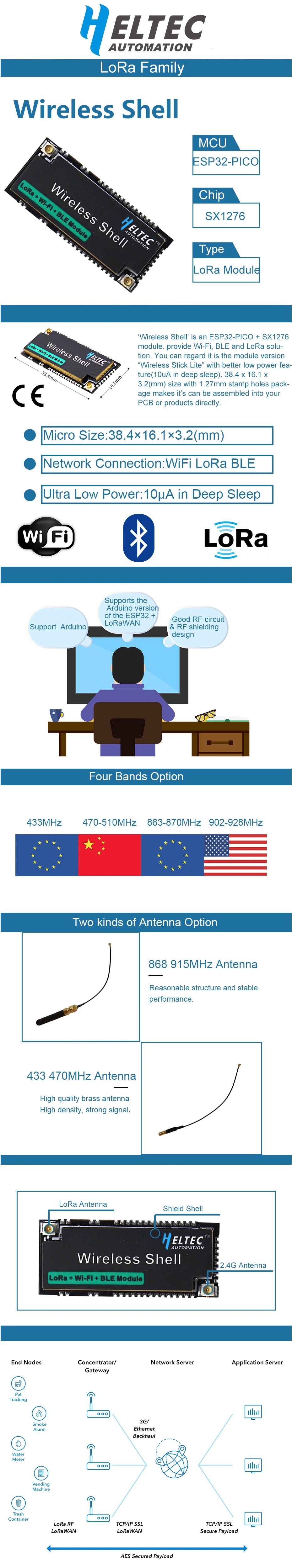 «Беспроводная оболочка»-это модуль ESP32-PICO + SX1276. Обеспечивает Wi-Fi, BLE и LoRa решение. Вы можете считать, что это версия модуля «Wireless Stick Lite» с лучшей функцией низкой мощности (10uA в глубоком сне). Размер 38,4x16,1x3,2 (мм) с отверстиями для штампов 1,27 мм позволяет собрать их непосредственно в печатную плату или продукцию.