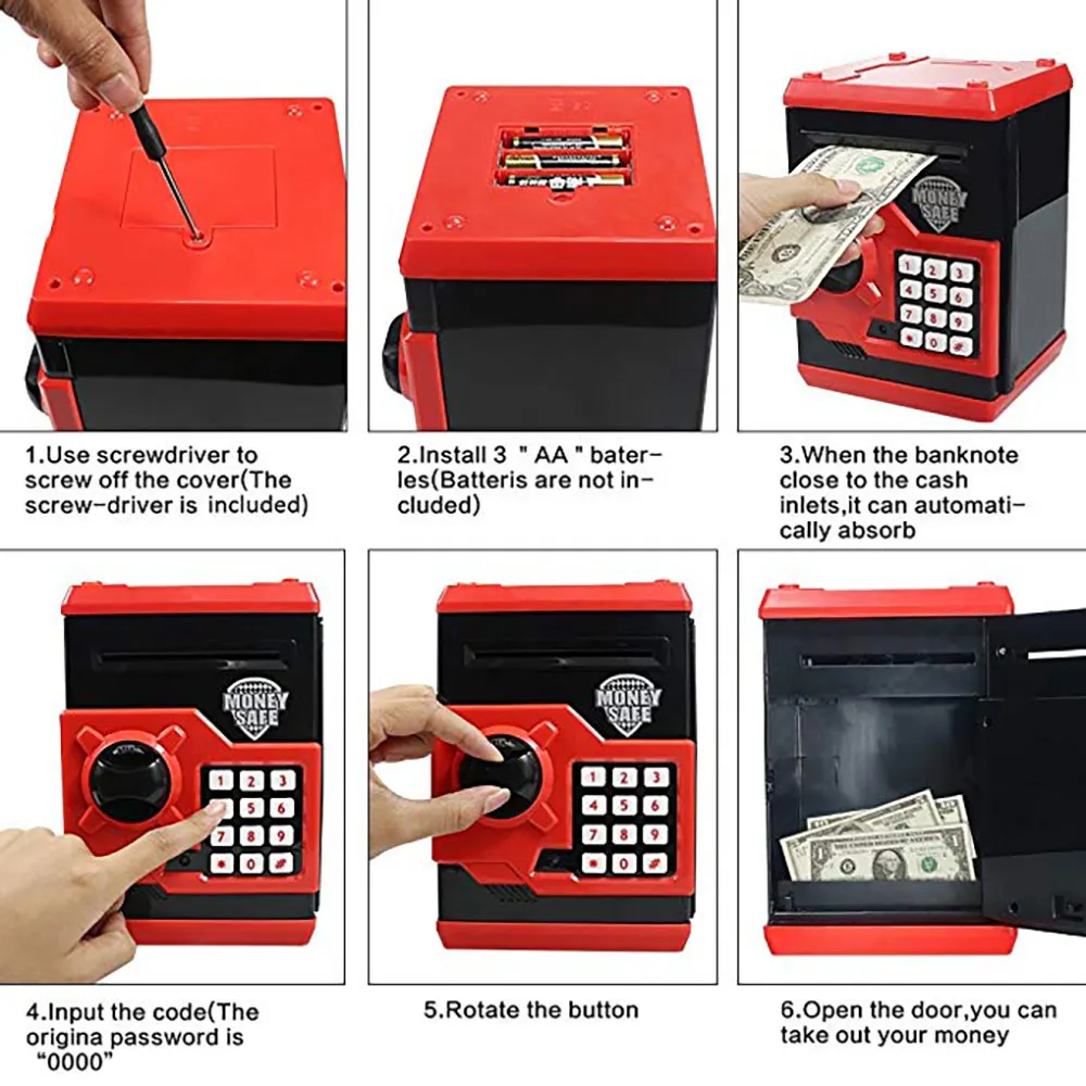 Особенности: Высокое качество и премиум АБС. Безопасный моделирование дизайн. Отличный подарок для детей, отличный подарок на день рождения для детей. Можно хранить 800 монет. Батарейки: 3 батарейки типа АА (не входят в комплект). Когда коробка для экономии денег нацелена на поступление наличных, она может автоматически поглощать. Защита паролем: Четыре электронных защиты паролем, если вы нажимаете неправильный пароль, он будет выдан. Использование: Для открытия сейфа необходимо сначала указать четырехзначный код. Безопасный пароль по умолчанию: 0000. 1. Введите 4 цифры, будет светиться зеленый индикатор. Если вы ввели неправильный пароль, светится красный индикатор, и вы можете услышать какой-то голос "пожалуйста, повторите попытку" 2. Затем поверните ручку по часовой стрелке, чтобы открыть дверь. Зеленый свет светит в течение 10 секунд, вы услышите писк двери. 3. Если дверь держится на открывании в течение более 10 секунд, зеленый свет перестанет светиться и издает Звуковой сигнал каждые 20 секунд. Закройте дверь, чтобы остановить писк. 4. Поместите банкноту прямо в рот. Введите пароль, после чего вы сможете снять деньги. 5. Когда вы закончите, пожалуйста, подтвердите, что дверь закрыта. Чтобы изменить пароль, выполните следующие действия: Введите текущий пароль (по умолчанию-0000) и откройте дверь. Удерживайте кнопку «*» вниз, и зеленый свет и красный свет мигают. В течении 15 секунд, введите Новый 4-х знака после запятой пароль, нажмите '#', чтобы хранить ваши новый пароль, как свет перестанет мигать. Звуковой сигнал Введите текущий пароль и откройте дверь (по умолчанию 0000) Нажмите на переключатель на двери влево или вправо, чтобы установить звуковой сигнал или звук. Закройте дверь сейфа. Внимание: Если новый пароль не был введен в течение 15 секунд, приложение остановит adn, вы должны перезагрузить его, чтобы перейти. Спецификация: Тип: Коробка для экономии денег Количество: 1 шт. Материал: АБС-пластик Цвет: белый синий/черный красный Батарея: 3 батарейки типа АА (не входят в комплект) Размер: 12,95*12*18,5 см Вес нетто: 600 г Комплект поставки: 1 * коробка для экономии денег