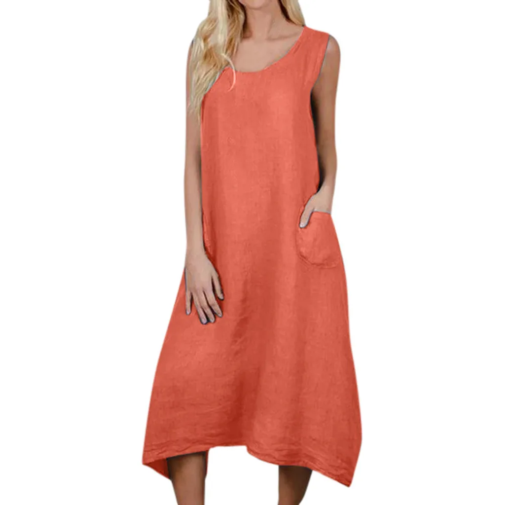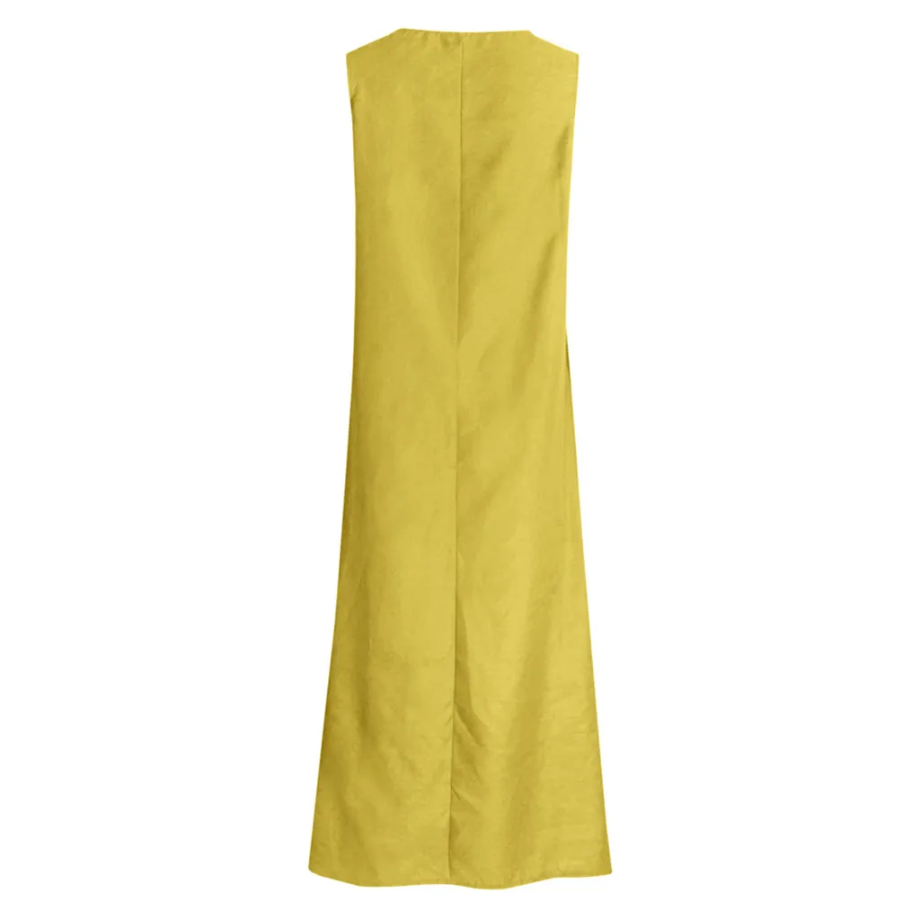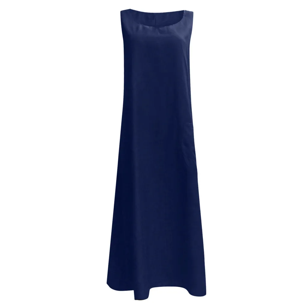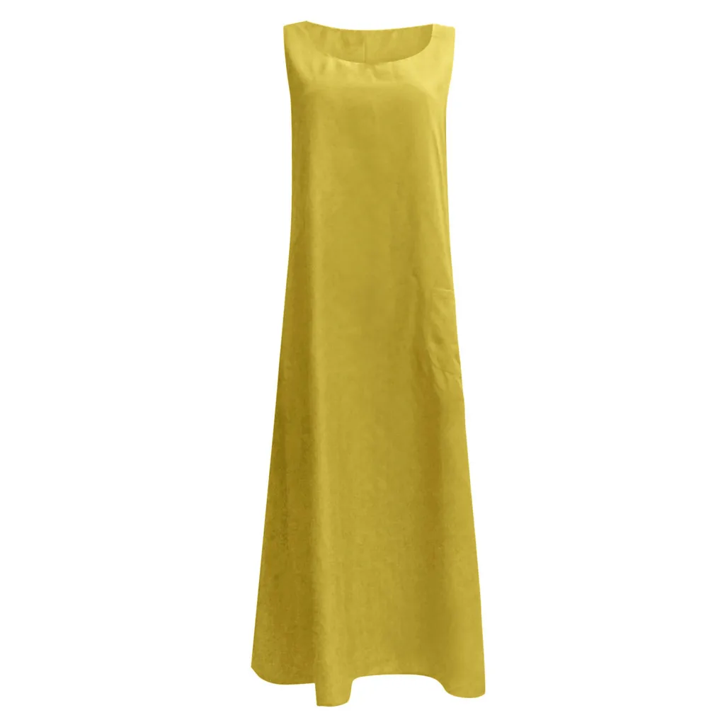 Женское повседневное однотонное платье без рукавов с вырезом лодочкой, льняное длинное платье с карманом