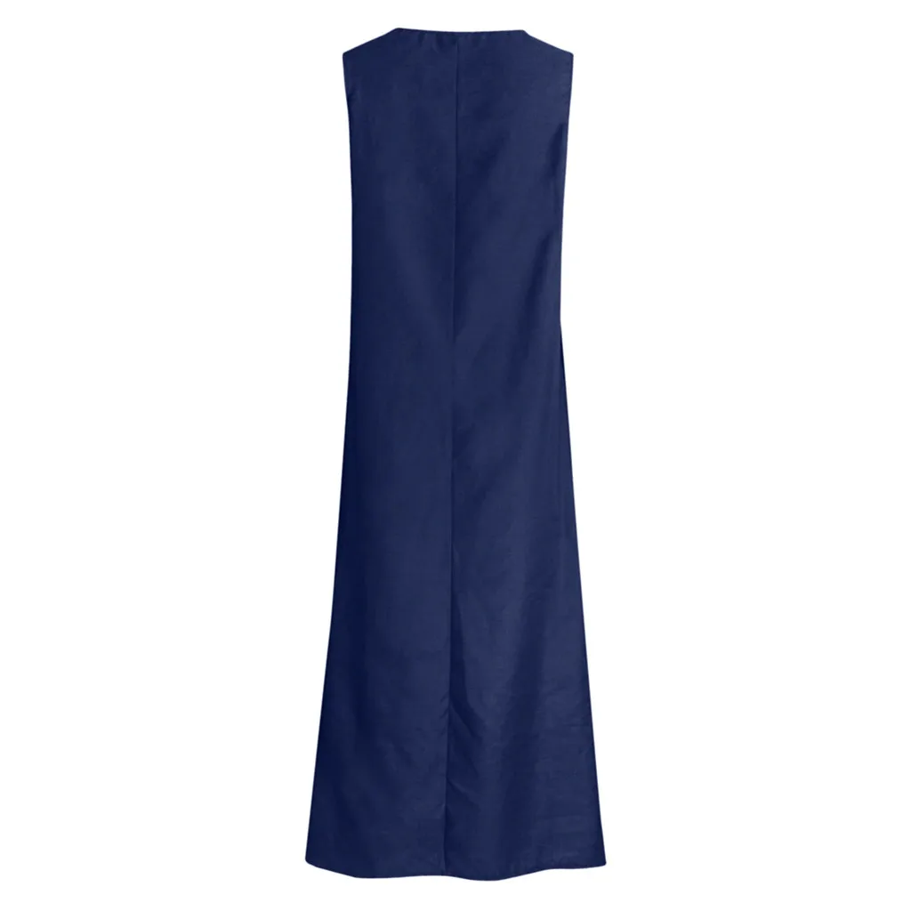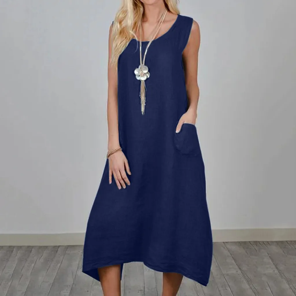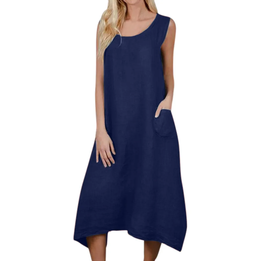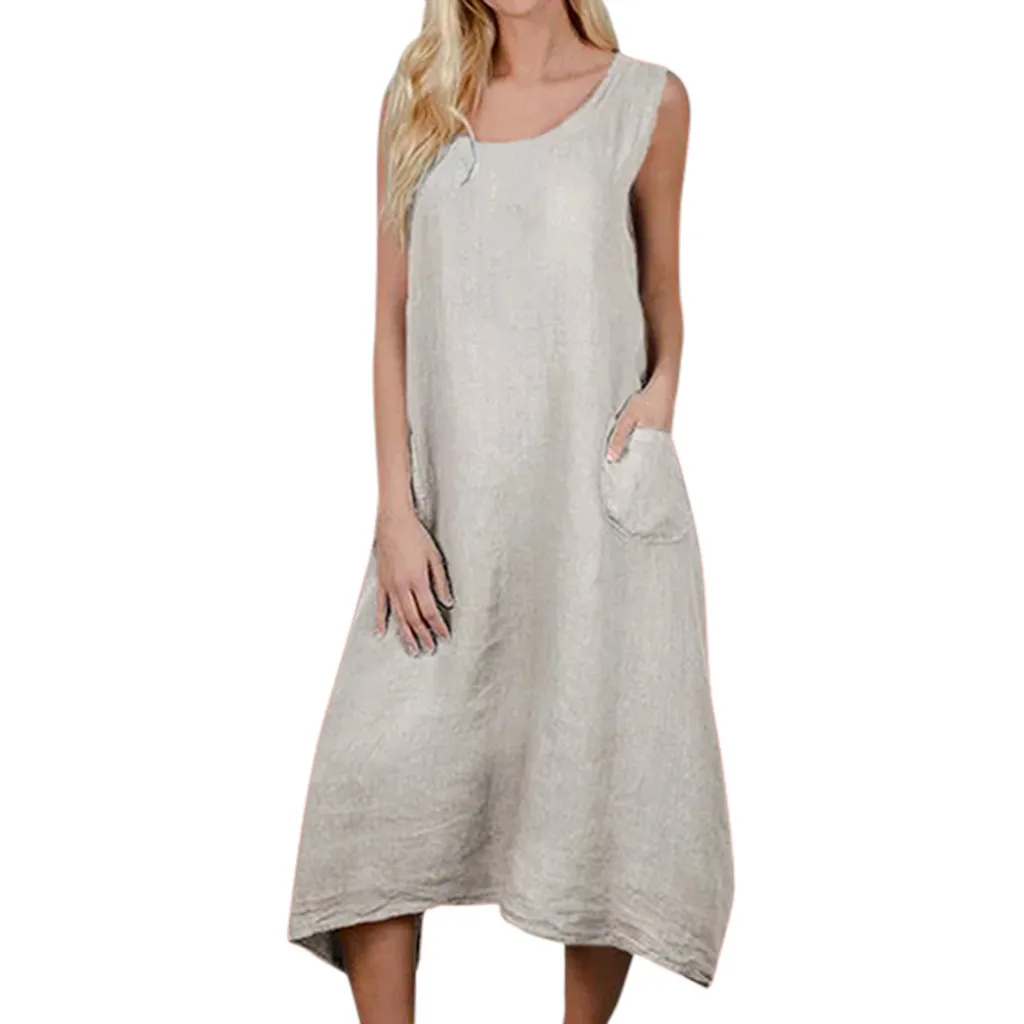 Женское повседневное однотонное платье без рукавов с вырезом лодочкой, льняное длинное платье с карманом