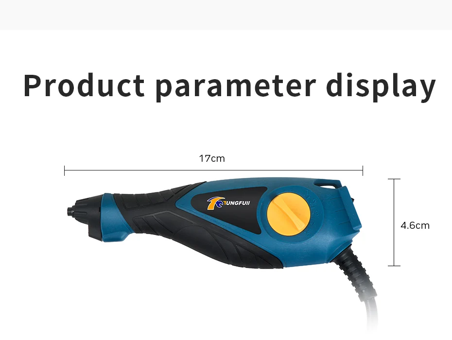 Размеры: 16х5, 5 см Напряжение: 230-50 Гц Входная мощность: 13 Вт Штрихи: 6000 штрихов/мин Материал: гравировальные наконечники-сталь Корпус и ручка-нейлон и TPR Значение вибрации: Ач = 4,981 м/с Вес корабля: 450 г