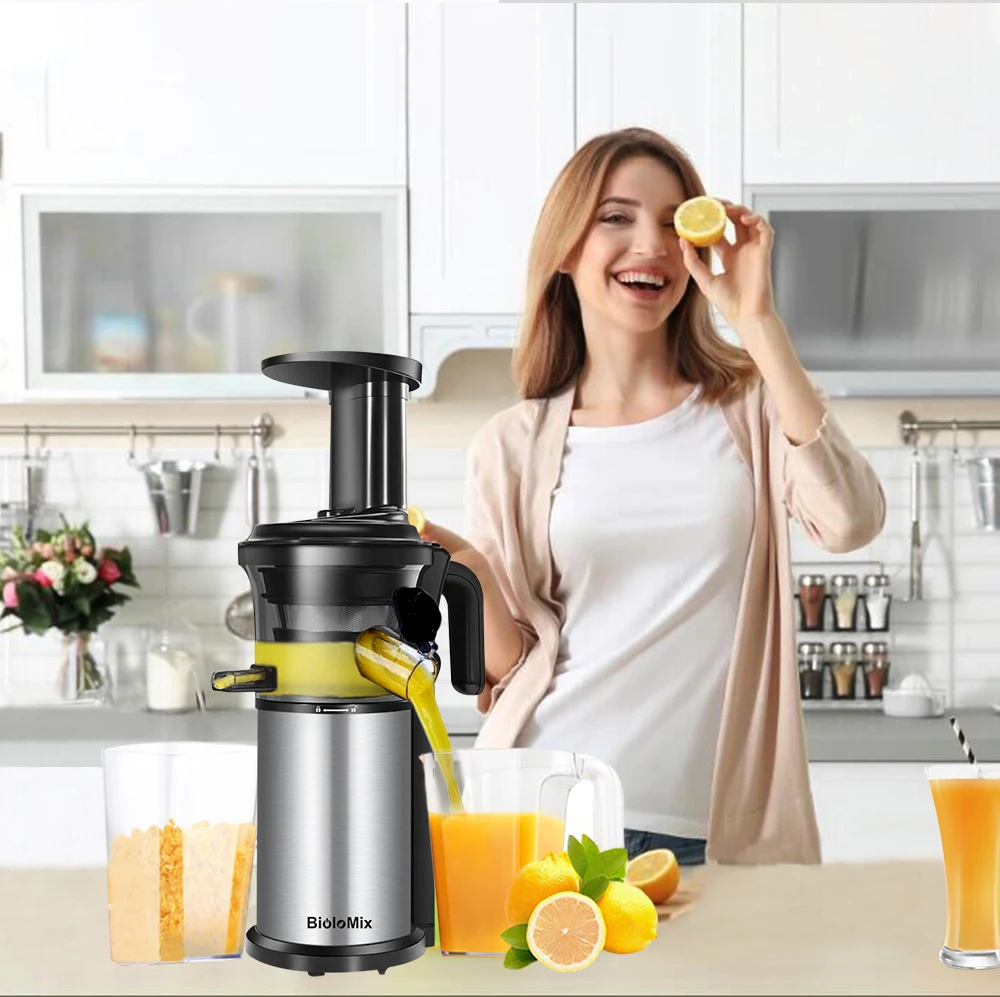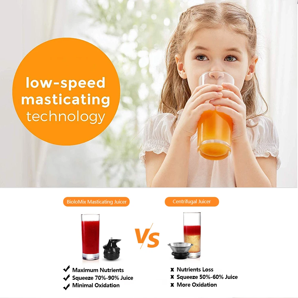 В настоящее время пришло время иметь полный здоровый и питательный организм! Попрощайтесь с этими соками с большим количеством воды и сахара. Медленная соковыжималка-это самые быстрые и легкие машины холодного пресса для вашего забавного сока. Это играет важную роль в современной кухне. Портативная мини-соковыжималка biolix имеет низкую скорость 40-65 об/мин, которая предотвращает окисление и сохраняет живые ферменты, питательные вещества и незаменимые витамины, уничтоженные трением или теплом с высокой урожайностью сока! Просто Наслаждайтесь здоровым днем с Biolomix! Лучший выбор для вас!