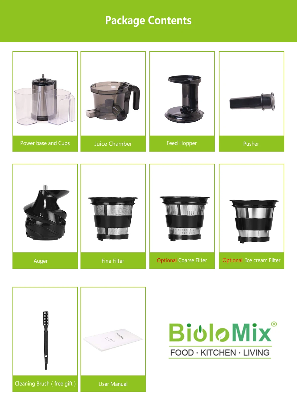 Как сделать мороженое с этой соковыжималкой: Положите замороженные фрукты, такие как клубника, яблоки, апельсины или лимоны в соковыжималку. Затем они будут измельчены как измельченный лед. Этот фильтр сохраняет лед и сохраняет его холодным.