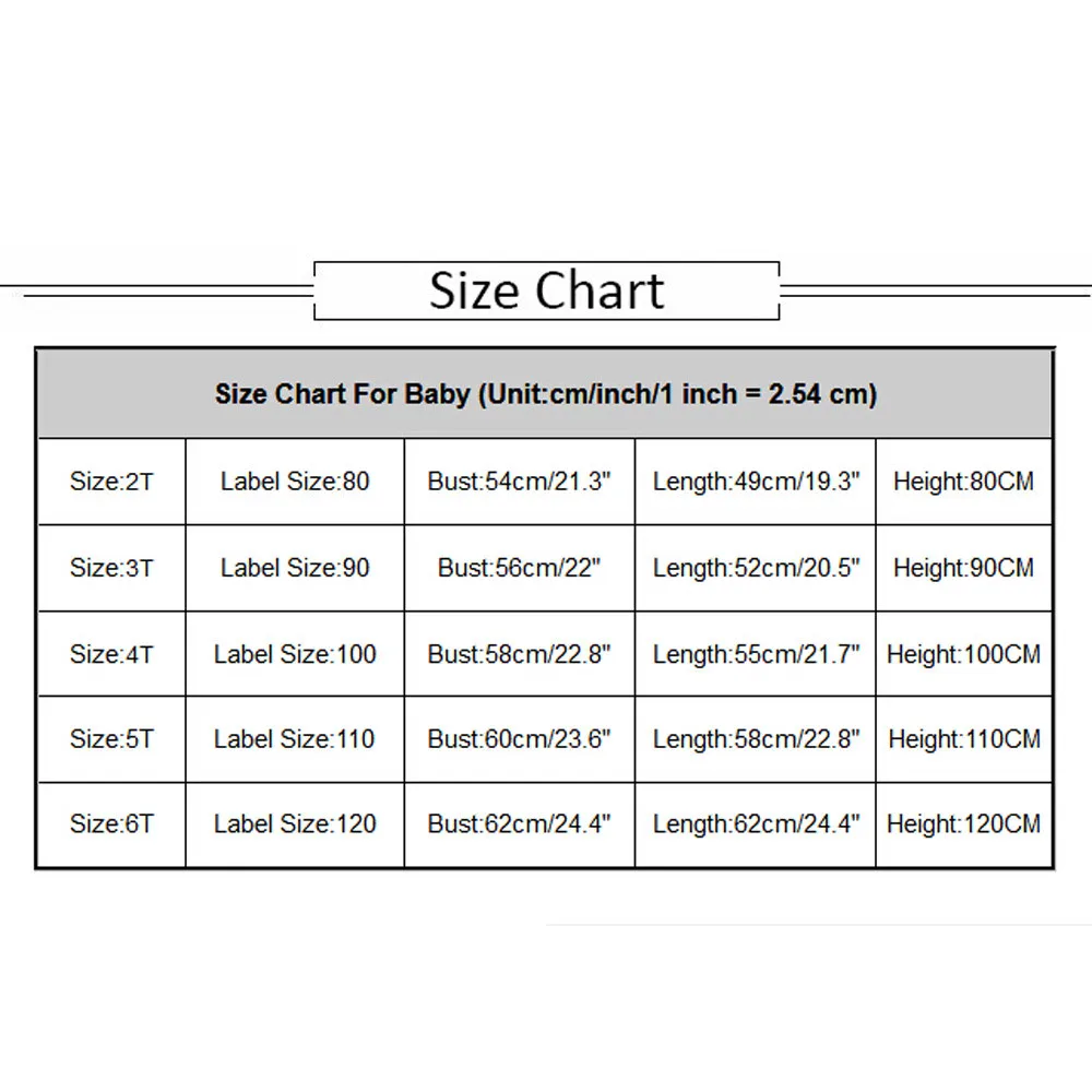 Таблица размеров для ребенка (единица измерения: см/дюйм/1) Дюйм = 2,54 см) Размеры:Для возраста 2 года Этикетка Размеры: 80 Бюст: 54 см/21,3" Длина: 49 см/19,3 дюйма Рост: 80См Размеры:3T Этикетка Размеры: 90 Бюст: 56 см/22" Длина: 52 см/20,5" Высота: 90См Размеры:4T Этикетка Размеры: 100 Бюст: 58 см/22,8" Длина: 55 см/21,7" Высота: 100См Размеры: 5 T Этикетка Размеры: 110 Бюст: 60 см/23,6" Длина: 58 см/22,8" Высота: 110См Размеры; Размер 6 T Этикетка Размеры: 120 Обхват груди: 62 см/24,4" Длина: 62 см/24,4" Высота: 120См