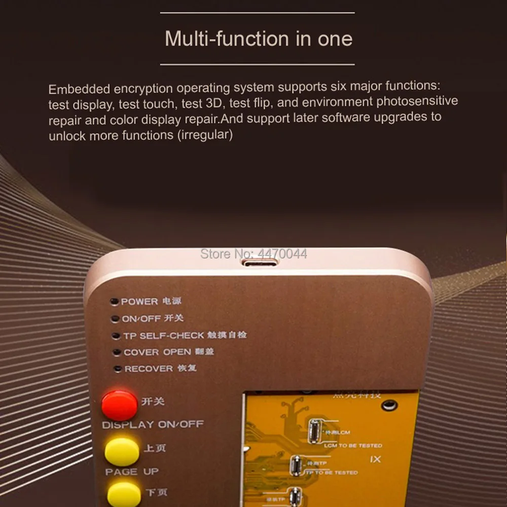 1. Данный тестовый прибор может проверить дисплеи моделей 6S/6SP/7 /7P/8/8P,XS MAX / XS / XR / X/11/11 PRO/11 PRO MAX, это очень легко и намного дешевле, чем тест на материнскую плату, одно устройство поможет вам сэкономить много денег, вы Не нужно покупать Материнские платы для каждой модели. 2. Функция тестирования, для ЖК-экрана изображения/сенсорного/3D сенсорного/тестирования яркости. 3. Для калибровки датчика, светильник и калибровки цвета.