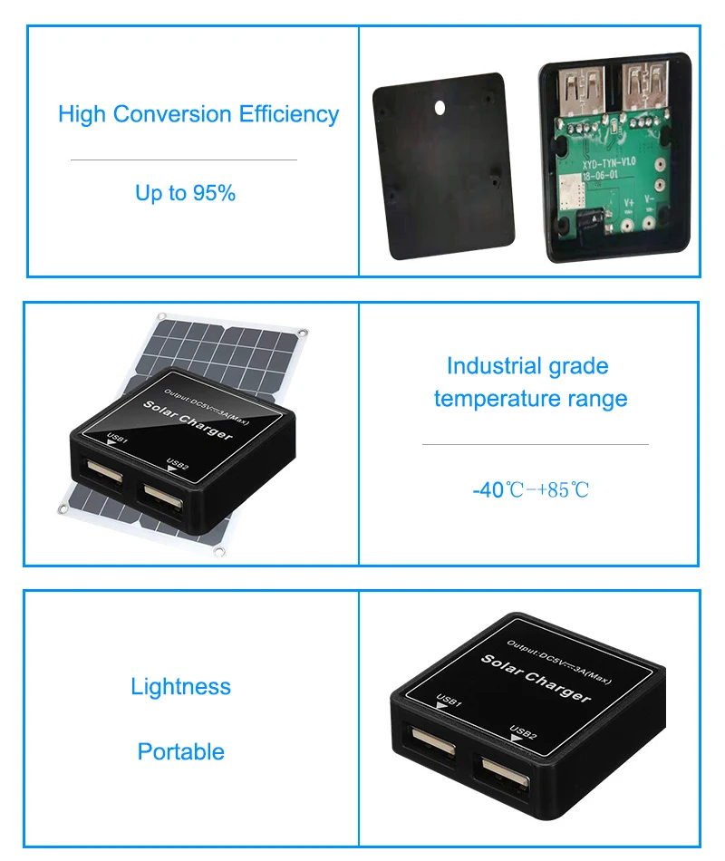 3. Пожалуйста, не ставьте зарядное устройство на открытом воздухе в дождливые дни в качестве экстренной зарядки, чтобы избежать короткого замыкания (передняя часть солнечной панели не боится дождя. Просто обратите внимание на интерфейс USB и DC)