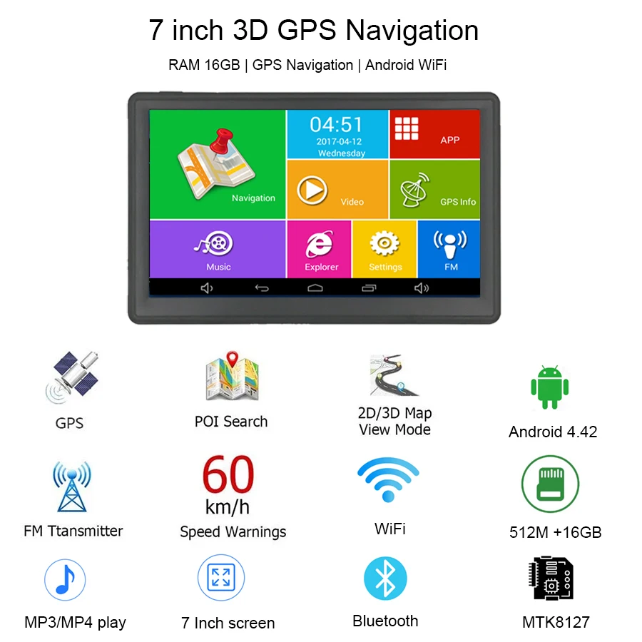 7-дюймовый емкостный сенсорный экран Экран Дисплей7 дюймов емкостный сенсорный экран 800*480 TFT большой экран, играть в игры, смотреть видео, ясно видеть дорогу и 5 точек емкостный сенсорный экран, четкий, чувствительный и может реагировать на незначительное касание.Встроенная Операционная система Android 4,42Встроенная 512 МБ ОЗУ + 16 Гб встроенной памяти, доступно около 0,49 Гб для установки приложений и около 13 ГБ внутренней памяти для хранения данных; Процессор MT8127, рука Cortex-A7 четырехъядерный процессор, 1,3 ГГц, Мали™-450 MP4 четырехъядерный GPU, плавная работаПодключение Wi-FiВстроенный WiFi поддерживает 802,11 b/g/n, вы можете заниматься серфингом в Интернете, смотреть видео, общаться с IM, загружать то, что вы хотите, и обновлять программное обеспечение онлайн.Функция fm-передатчикаКогда этот Автомобильный видеорегистратор устанавливает ту же частоту FM, что и автомобильное радио (eg.87.9), видеорегистратор будет выводить аудио через функцию fm-передатчика на ваш автомобильный динамик.Подключение по Bluetooth (опционально)Bluetooth 4,0 технология в применении bluetooth для передачи данных (музыка, видео) на устройствоGPS навигация3D навигация, карты предлагает бесплатные обновления для жизни, когда есть новая карта, мы отправим на ваш адрес электронной почты.Мы предварительно загрузим карты в соответствии с именем страны в адресе доставки. Если вам нужны дополнительные карты, пожалуйста, оставьте нам сообщениеИнтеллектуальное голосовое путешествие, напоминающее все пути, не нужно беспокоиться о проезде по дороге.Парковка с реальным видом заднего вида (опционально)Камера заднего вида включается автоматически при переключении в обратную передачу, она имеет чрезвычайно широкийУгол обзора 120 градусов, что обеспечивает более чем достаточный обзор того, что находится за вашим автомобилем.