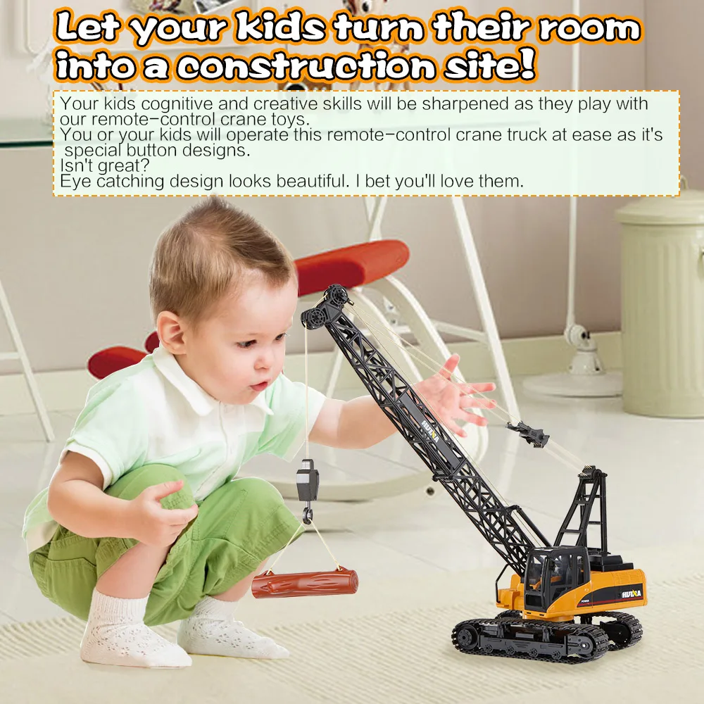 Крючок идет вверх и вниз, Радиоуправляемый кран может двигаться вперед и назад на Противоскользящих дорожках шин, и он может повернуть влево и вправо с реалистичными огнями и звуками. Кран может вращаться на месте на 360 °, верстак крана может выполнять вращение на 680 °.
