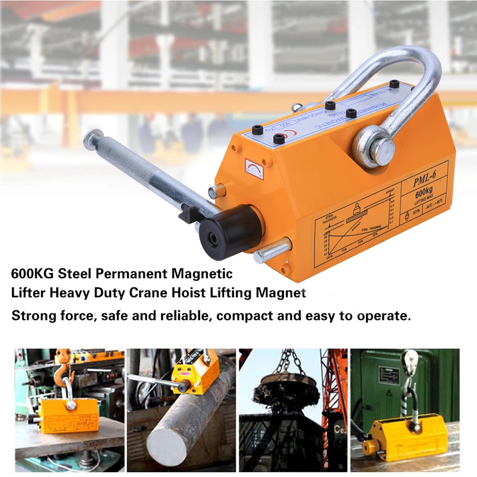 Этот Магнитный подъемник используется для подъема стальных листов, блоков, стержней, цилиндров и других магнитных материалов. Ручка на магните оснащена механизмом блокировки/блокировки, который требует от оператора ручного переключения между двумя состояниями. Кран с постоянным магнитом подходит для подъема и транспортировки стальной пластины при комнатной температуре в судостроении, строительной технике, автомобилях и других отраслях промышленности. Он широко используется на заводах, доках, складах и транспортных отраслях. Мы используем передовые N45 магнитные материалы для обеспечения супер сильной магнитной силы, с imum тягой 600 кг/1320lbs