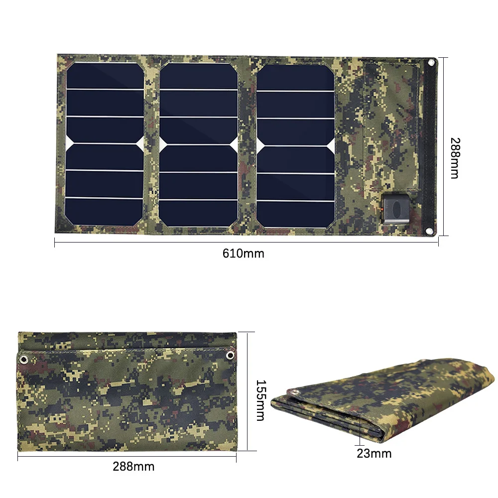 Выход зарядного порта: 5 В постоянного тока Мощность: 20 Вт Разворачивающийся Размер: 610x285*5 мм Размер в складку: 165x 285*20 мм Вес: 500 г