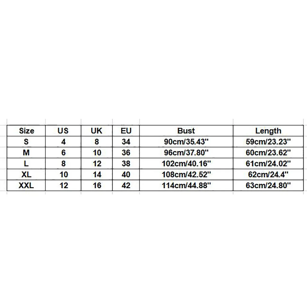 Размер США Великобритания ЕС Бюст Длина S 4 8 34 90 см/35,43'' 59 см/23,23'' М 6 10 36 96 см/37,80'' 60 см/23,62'' L 8 12 38 102 см/40,16'' 61 см/24,02'' XL 10 14 40 108 см/42,52'' 62 см/24,4'' XXL 12 16 42 114 см/44,88'' 63 см/24,80''