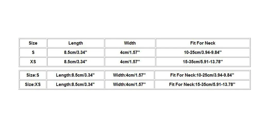 РазмерДлинаШиринаПодходит для шеиS8,5 см/3,34"4 см/1,57 дюйма10-25 см/3,94-9,84''XS8,5 см/3,34"4 см/1,57 дюйма15-35 см/5,91-13,78''