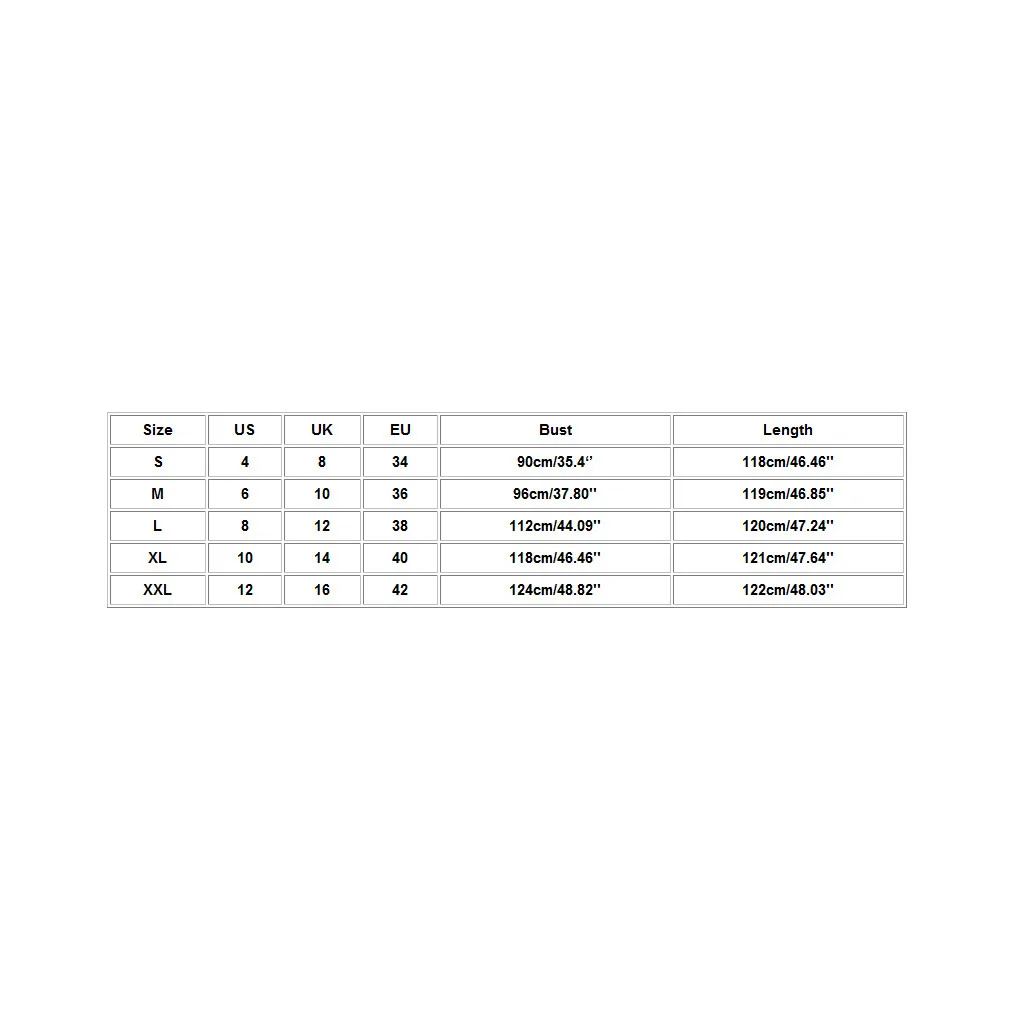 Размер США Великобритания ЕС Бюст Длина S 4 8 34 90 см/35,4'' 118 см/46,46'' М 6 10 36 96 см/37,80'' 119 см/46,85'' L 8 12 38 112 см/44,09'' 120 см/47,24'' XL 10 14 40 118 см/46,46'' 121 см/47,64'' XXL 12 16 42 124 см/48,82'' 122 см/48,03''